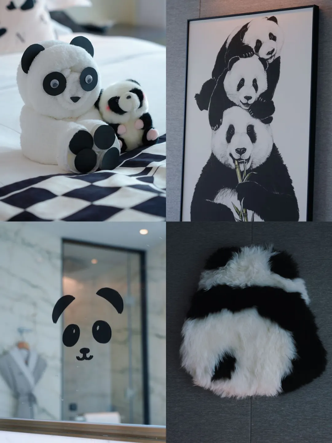 房间到处都是熊猫元素,床上🈶️毛巾叠成的熊猫“宝宝”和腮红熊猫;小帐篷里🈶️大熊猫公仔和装满零食的熊猫背包;就连洗漱间镜柜上都贴上了熊猫造型~我真的仿佛掉进了熊猫窝