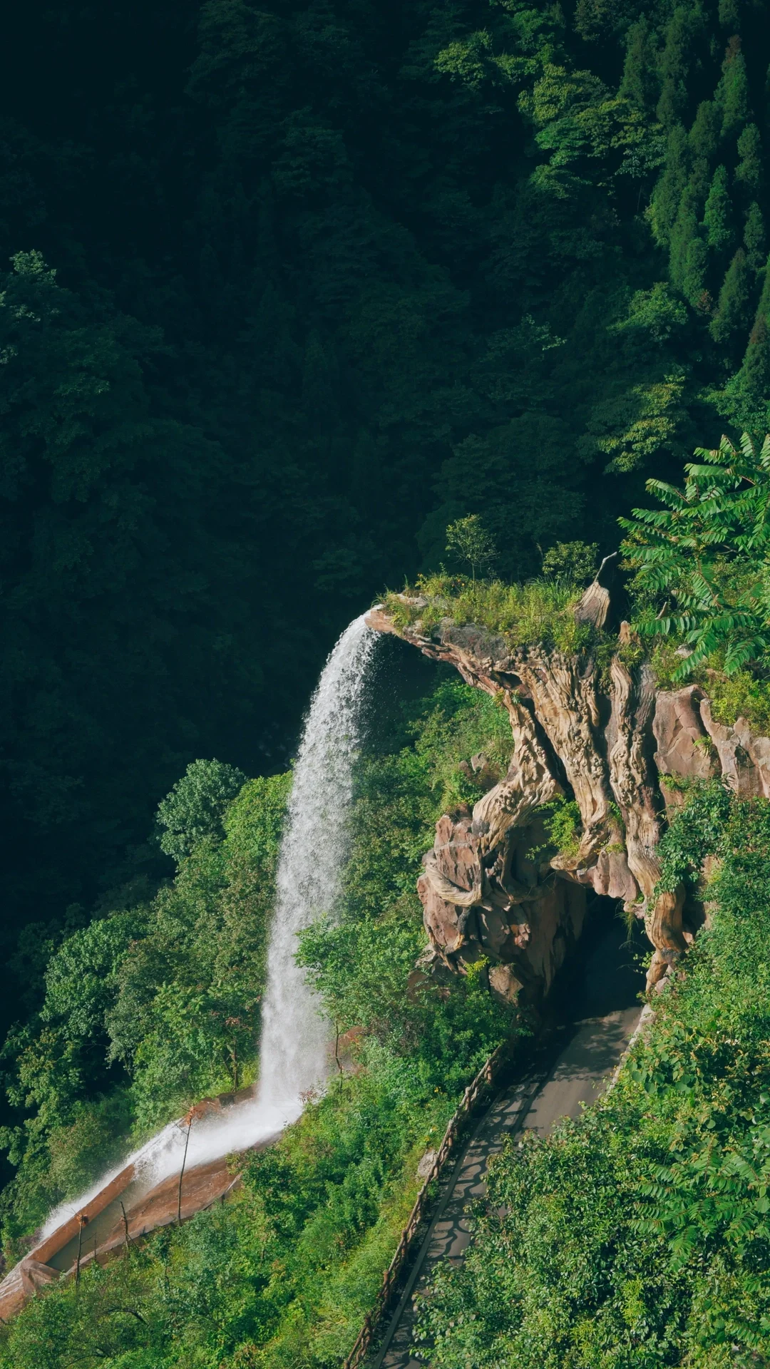 落差达三百米的雄伟瀑布,宛如一条巨龙从山顶腾空而下,声震山谷,给人以强烈的视觉冲击。