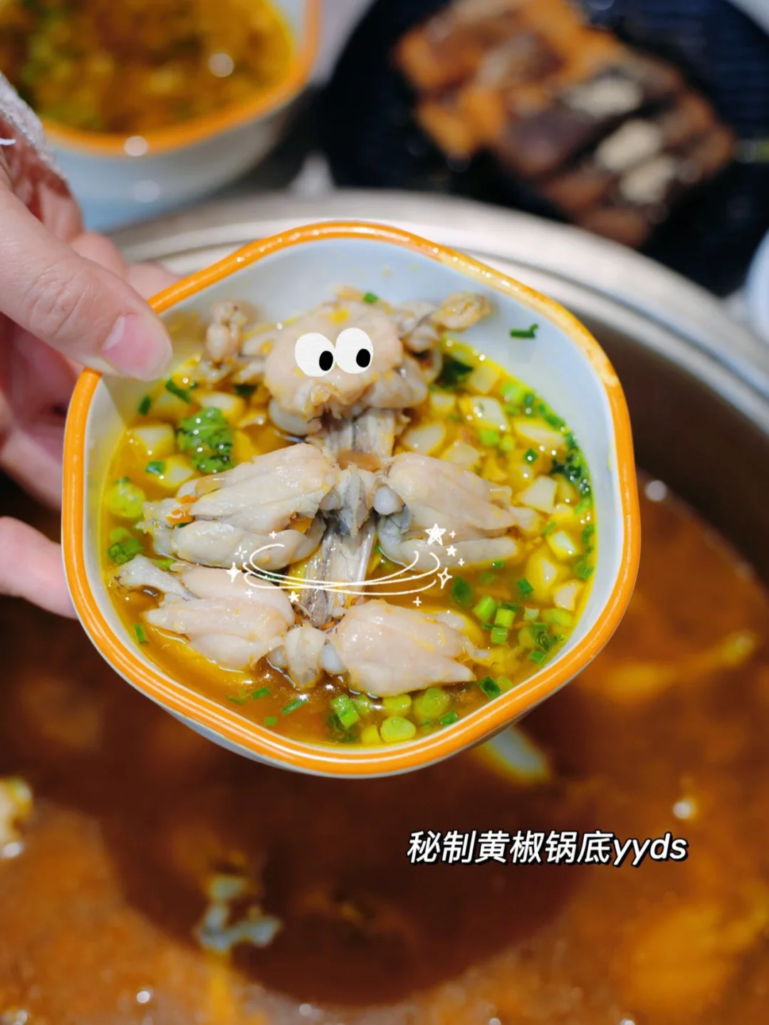 ✔️招牌黄椒锅底:独创的锅底非常开胃,辣度拿捏得恰到好处,蛙蛙下锅煮几分钟轻轻一抿就下来了