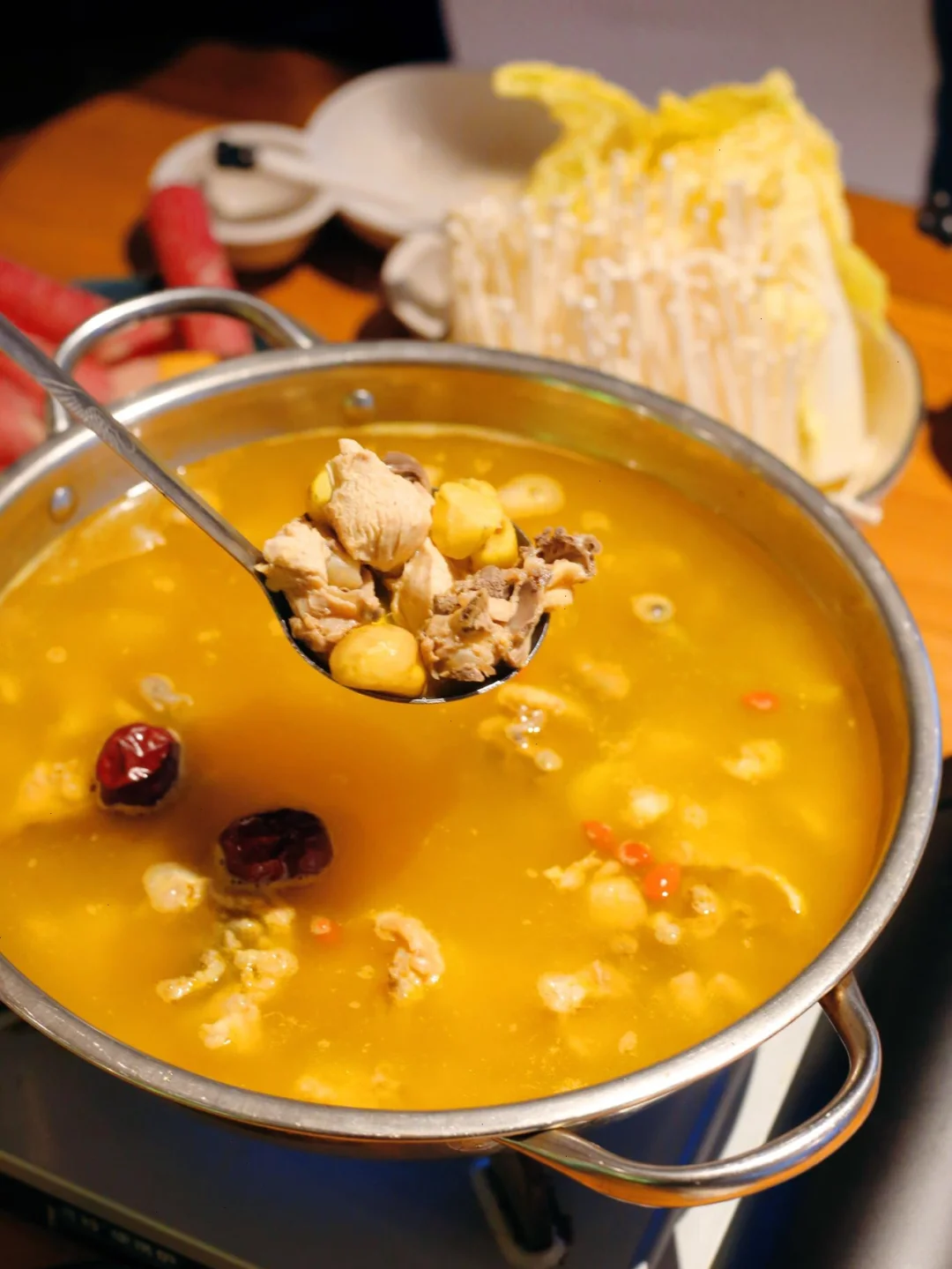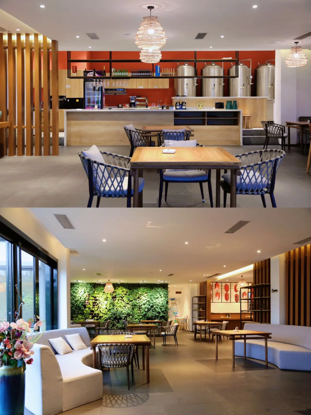 酒店餐厅🍴180°观景,视野绝佳,🈶️牛排、汤锅、炒菜、烧烤、pizza和意面🍝以及精酿啤酒🍻等等!我们选的板栗🌰汤锅,里面的鸡肉很多,还配了涮菜🥬,分量很实在,野生板栗非常好吃又养生~早餐也很让人惊喜!6宫格的位餐,包子,粥,小菜等~