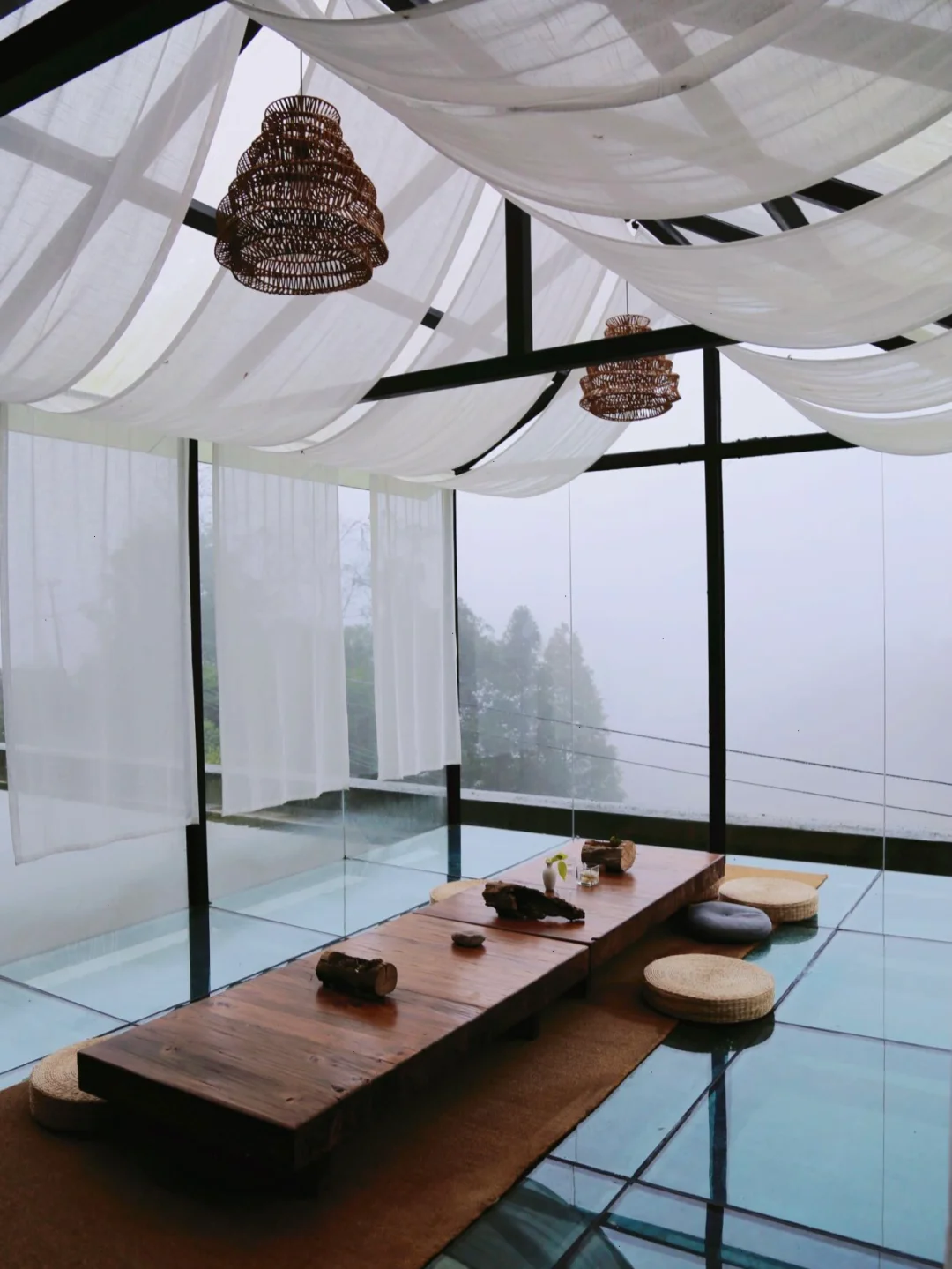一共5栋建筑🏠,主楼1楼是停车场,2楼是餐厅,3楼是大堂,整个装修古朴又时髦,传统又现代!大厅面对山景的是一整面落地窗户,室外🈶️一个小池塘环形的休息区,绕水而坐,可遥看青城山的“金鞭岩”及“老君阁”⛰最不能错过便是这个网红茶室,270°全景玻璃犹如漂浮在水上,拍照特别出片~