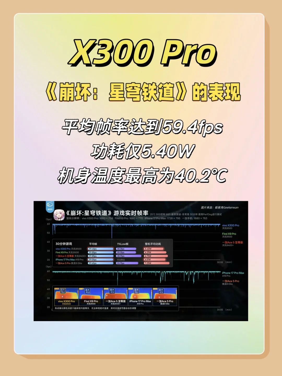 游戏表现更是炸裂,在极客湾的测试中,X300 Pro在崩铁中的平均帧率达到59.4fps,功耗仅5.4W,机身温度最高为40.2℃
