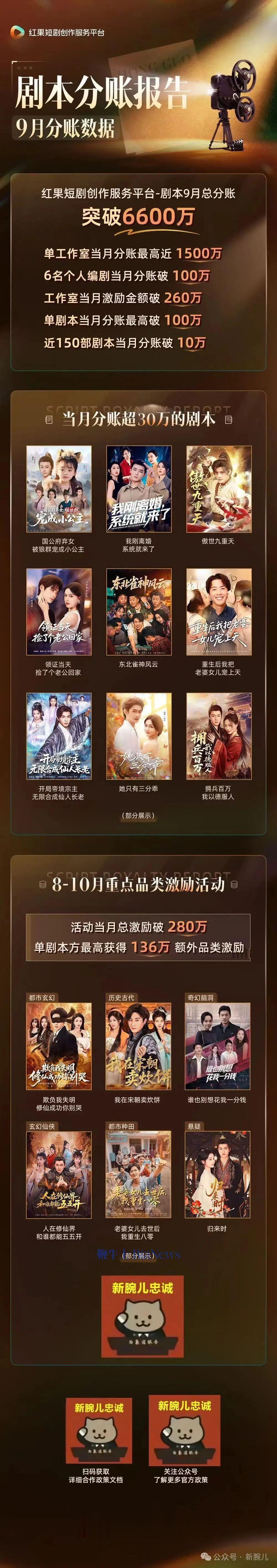 9月数据显示,单月剧本分账突破6600万。(转载自新腕儿)