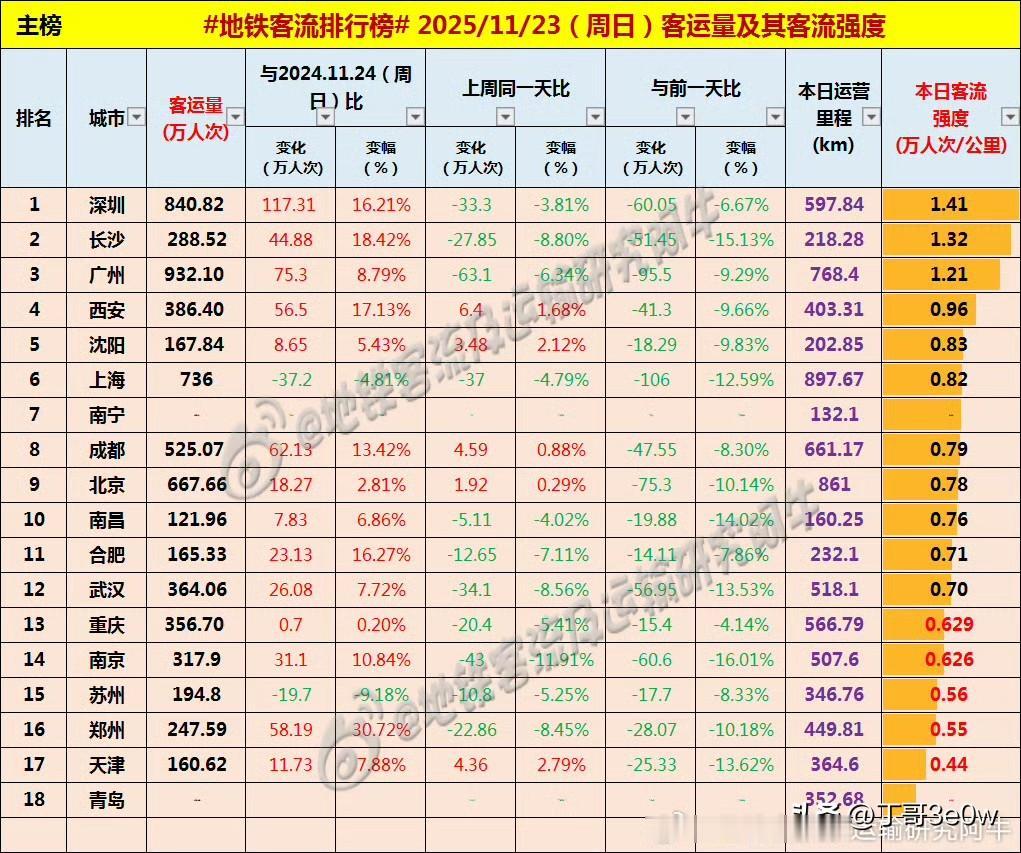 合肥地铁客流量昨日165万人次以上,勇超天津[呲牙][呲牙][呲牙] 爆料 身边事 地铁客流排行榜 中国地铁客流日报 昨日客流 排行榜 周日 合肥地铁 2025年11月23日 星期天 全国重点城市轨道交通客流量排行榜: 广州:932.10万广州地铁 深圳:840.82万深圳地铁 上海:736.00万 北京:667.62万 成都:525.07万 西安:386.40万西安身边事 武汉:364.04万武汉地铁 重庆:356.70万 南京:317.90万南京爆料 长沙:288.52万长沙身边事 郑州:247.59万 苏州:194.80万苏州爆料 沈阳:167.84万沈阳身边事 合肥:165.33万 天津:160.62万天津身边事 南昌:121.96万 青岛:100万+青岛爆料 南宁:100万+