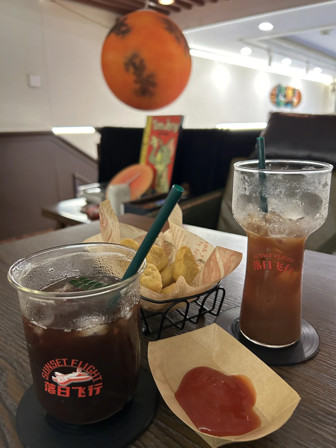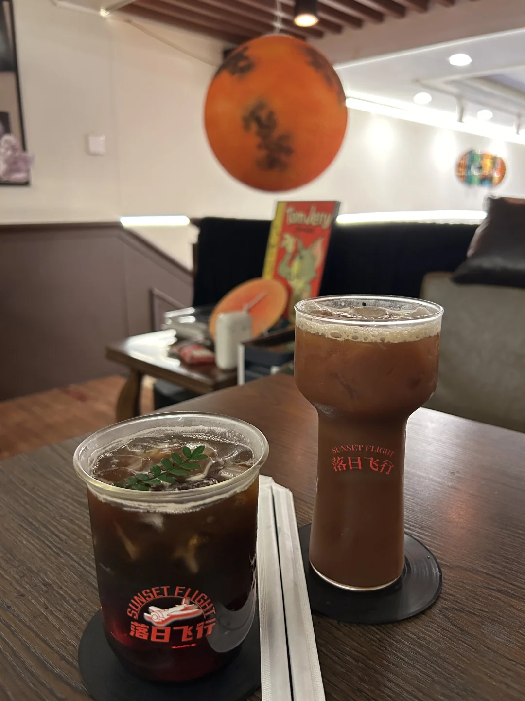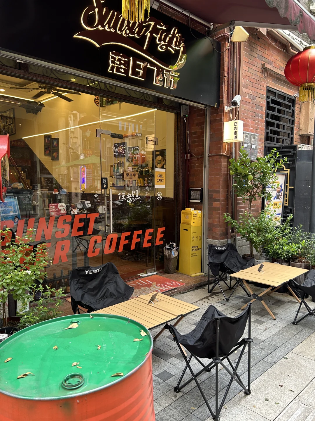 100家探店计划 家人们!今天带你们解锁广州老城区的宝藏玩法——藏在西门口骑楼群里的「落日飞行」酒吧咖啡店!从地铁站出来步行不到10分钟就能钻进这个时空胶囊,白天是治愈系咖啡馆,夜晚化身微醺小酒馆,一篇攻略带你玩转日咖夜酒的双重快乐✨ 📍【位置玄学大公开】 从西门口地铁站D口出来往左走,沿着中山六路的骑楼街晃荡300米,看到写着「惠吉西」的蓝色路牌右转。重点来啦!!!注意右手边的金属小门🚪,推开门瞬间仿佛掉进电影里的复古机舱——裸露的红砖墙上挂着皮质飞行夹克,天花板垂落的复古煤油灯在水泥地面投下暖黄光晕,吧台小哥正在用老式手摇磨豆机磨豆子,空气里飘着柑橘与焦糖交织的香气☕️ 💫【环境细节控狂喜】 ▪️工业风吧台:金属支架搭配胡桃木台面,吧台上摆着复古打字机和地球仪,随手一拍就是美式复古大片 ▪️落日灯墙:整面墙的渐变日落灯太绝了!下午4点后阳光斜斜照进来,光影在水泥地上流淌,建议穿浅色针织衫来拍发光发丝 ☕️【饮品点单不踩雷指南】 ⚠️划重点:白天咖啡晚上酒,菜单会随时间切换哦! ✅落日航班 分层超美的特调咖啡!我点的是葡萄冰美式,淡淡的葡萄香味,还有咖啡结合在一起非常好喝,回味无穷,建议搭配店里自制的自制的烤鸡块,咸甜交织绝了!