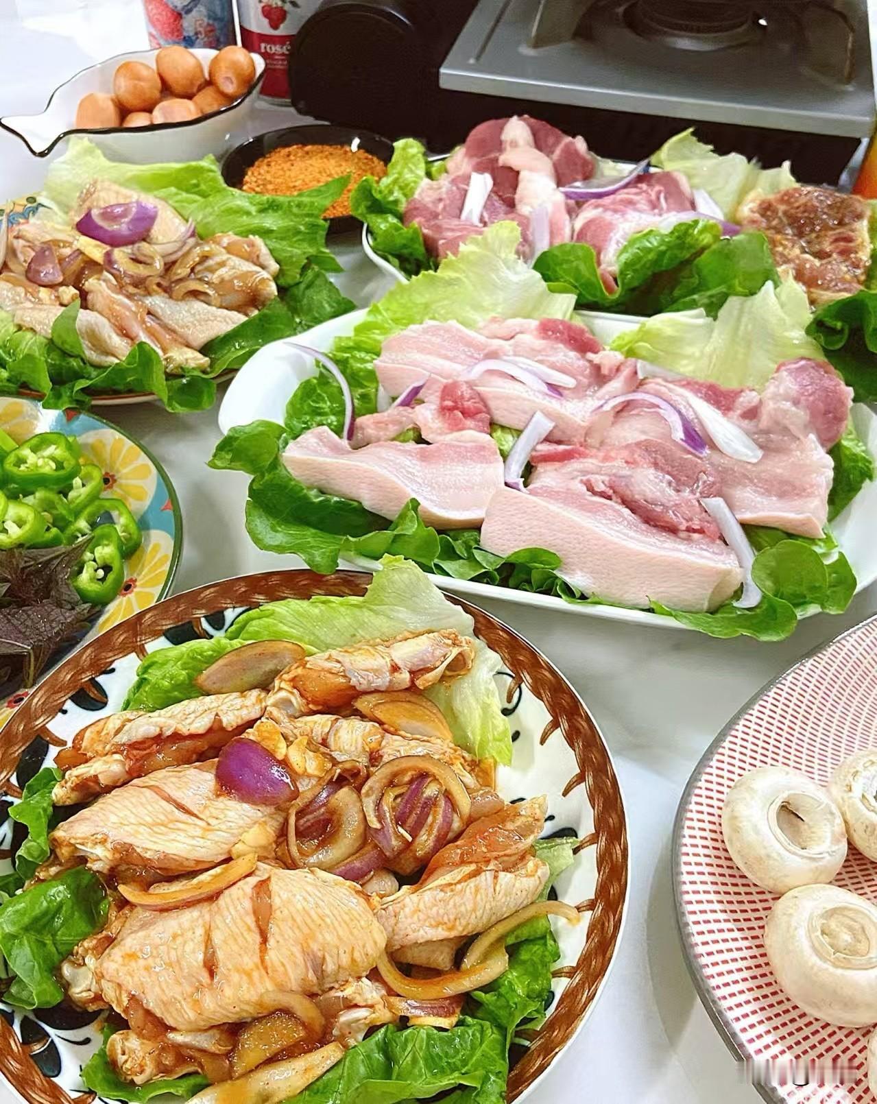 “快把五花肉下烤盘!”我刚夹起一片鸡翅,我妈已经举着夹子催了。油花儿“刺啦”一响,我爸立刻凑过来:“先烤这片,看这肥瘦!” 刚翻个面,我弟嗷一嗓子:“口蘑口蘑!汁水烤出来才鲜!” 等五花肉焦边儿,裹片生菜塞嘴里,我含糊着喊:“鹌鹑蛋熟没?快给我妈夹一个!”厨房飘着肉香,说话都裹着烟火气,这日子可太熨帖了~