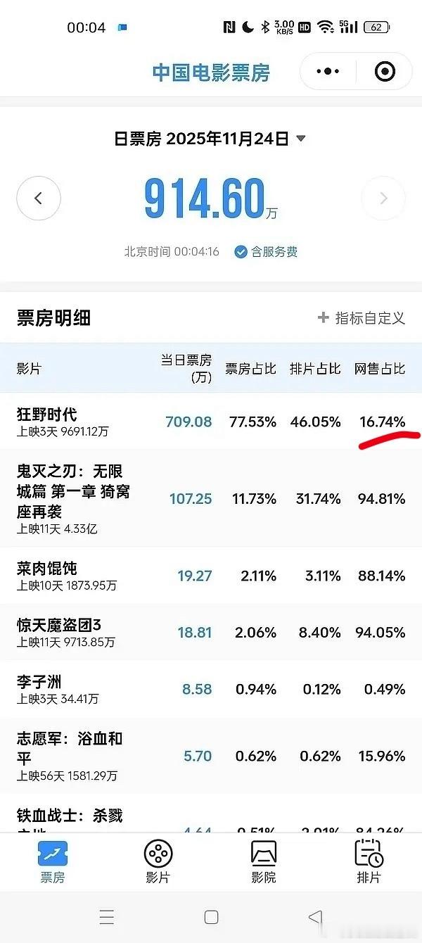 退票率15%,以及昨日网售比异常仅37%,你以为够低了吧?11.24凌晨0点左右低至16.74%11.24日8:40的网售比19.08%目前,网售比低的特别突出的,一个是于适《欢迎来到我身边》47.17%还有去年朱一龙《负负得正》28.83%易烊千玺《狂野时代》是新低