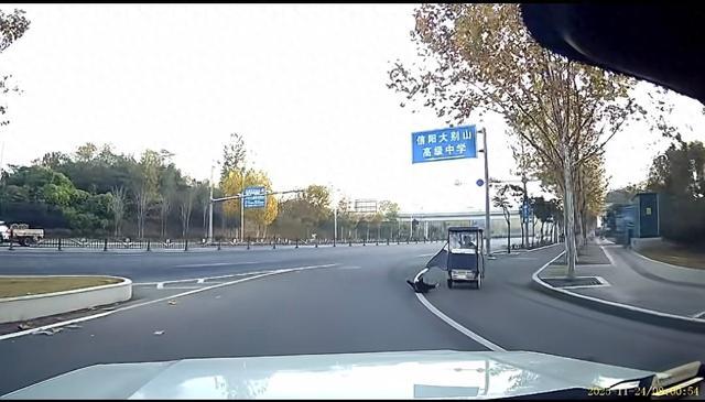大皖新闻讯11月24日上午,一则行车记录仪监控视频引发关注。视频中,一辆电动三轮车在转弯时突然从后座甩下来一名儿童,三轮车驾驶人没有发现,仍继续向前行驶。后车驾驶员发现这一情况后,立马按喇叭并呼喊提醒。
