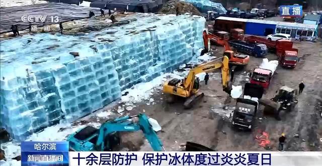 其实存冰技术古时候就有,过去把冰放在冰窖里储存,夏天用来消暑或给食物保鲜。存冰主要原理就是隔绝,要隔热、避光、隔绝雨水渗漏,隔绝空气进入,冰雪大世界这么大体量的存冰,就是将古法技艺与现代先进的隔绝材料相结合,每一个冰垛都设置了由塑料布、隔热棉等材料形成十多层防护层,起到了很好的保护作用,让冰块即便在地上开放的区域也能安然度夏。