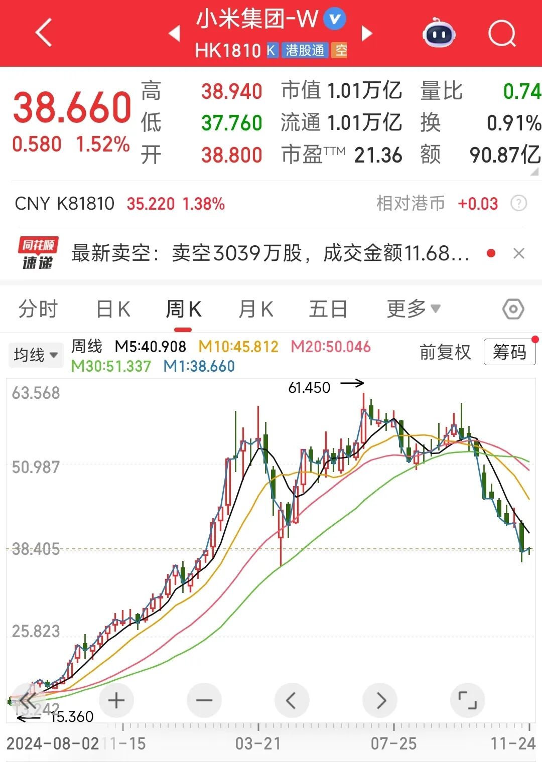从去年9月份开始,小米集团股价大幅上涨,直到今年6月份站上61.45港元/股。但随后震荡调整,7月份至今,小米集团股价已跌超35%。