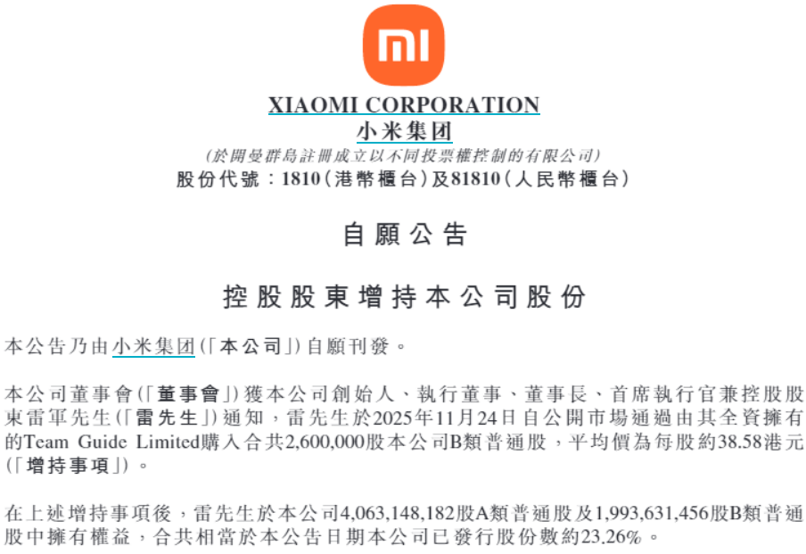 在上述增持事项后,雷军持股比例增加至23.26%。小米集团表示,董事会认为增持事项显示雷军对公司的发展前景及增长潜力充满信心,以及其对公司的长期承诺。