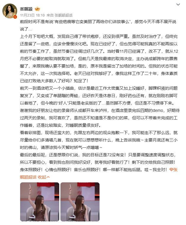 11月23日,“张靓颖长文谈身体情况”“张靓颖说不能再按以前节奏工作了”的词条,冲上微博热搜。当晚,歌手张靓颖在社交平台发长文,称自己上个月确诊了带状疱疹,虽然及时治疗了,但终究还是留了一些疤。她表示,“现在已经好了,但也觉得,可能我真的不能再按以前的节奏工作了。”