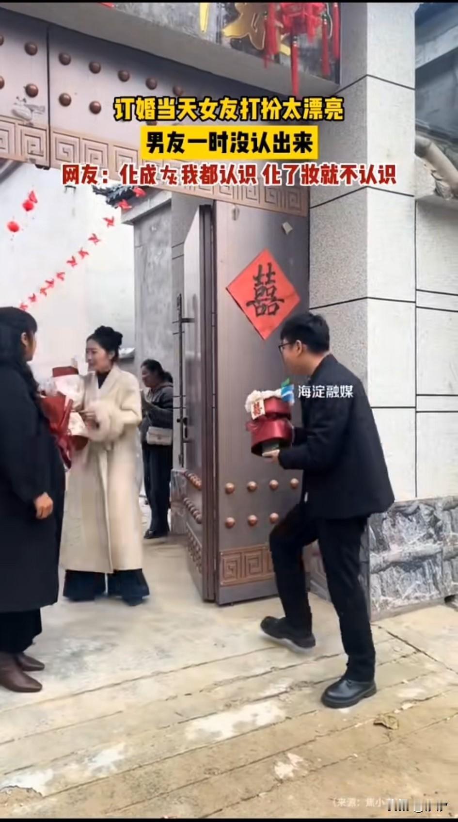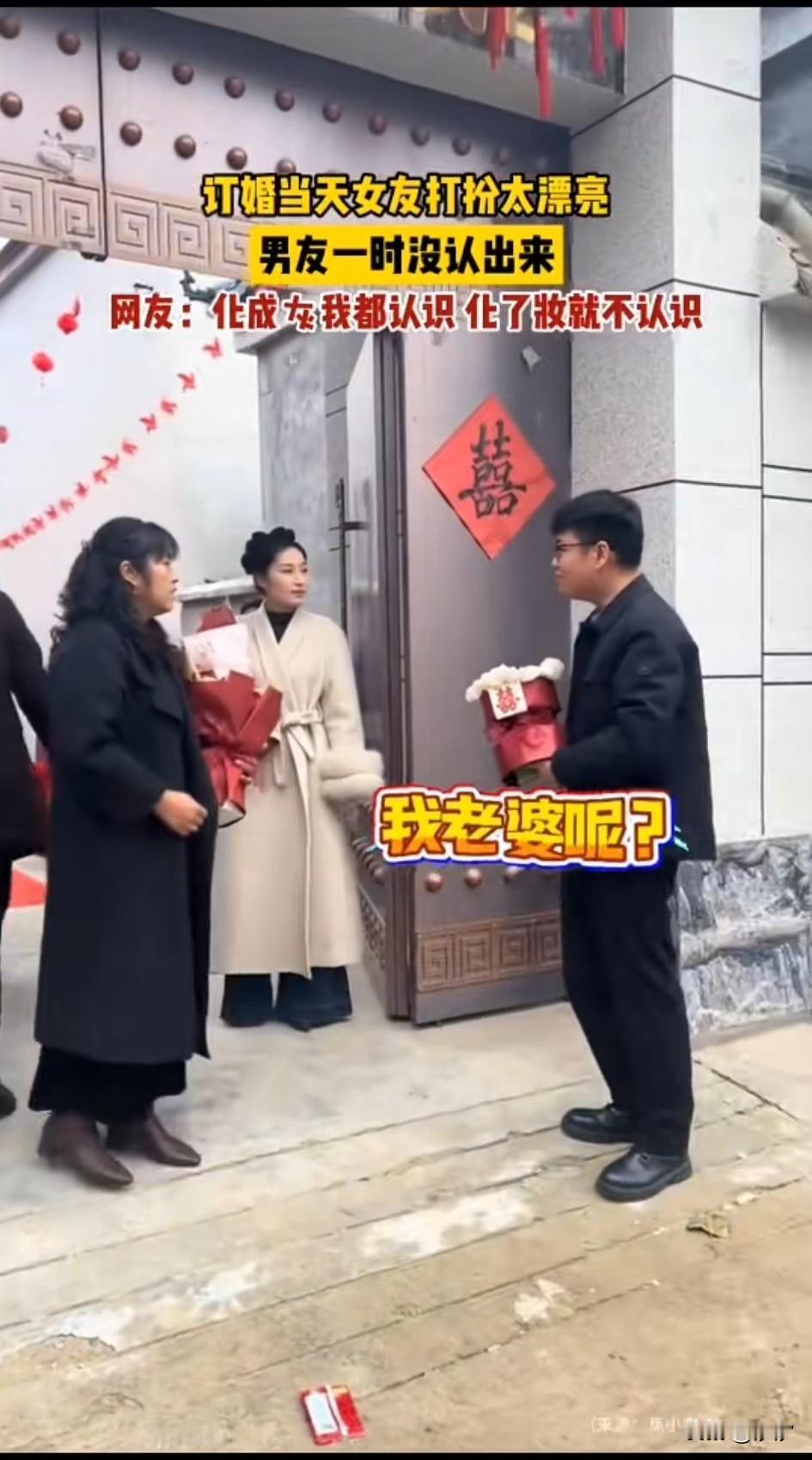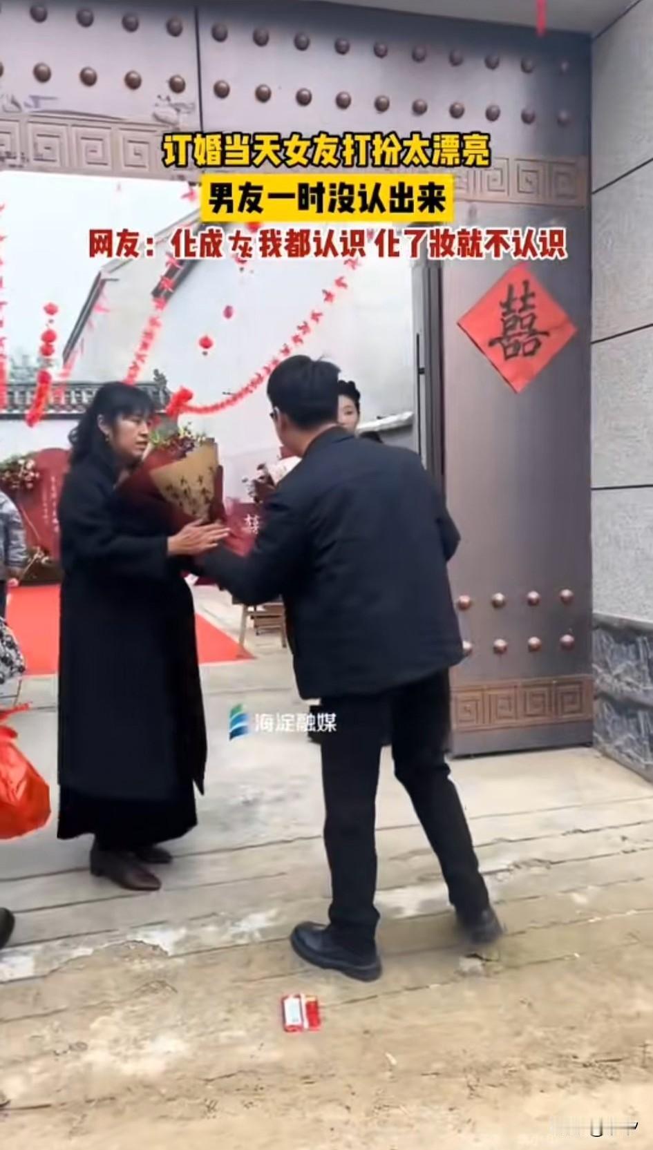 订婚当天男子拿着整束玫瑰花, 下车后迈着六亲不认的步伐, 快步走向女友家门, 因为多出了很多看戏的村民, 男子上门后碰见了丈母娘, 他的女友化完妆后就站在旁边, 上次瞅了半天也没看到他的女友, 就把花儿送给了丈母娘, 对旁边的女友视而不见, 还问丈母娘我女友在哪? 这可把他的女友吓了一跳, 差点没有反应过来, 叫了一声男子的名字, 男子这才发现旁边站的女的就是他的女友,女友平时不化妆, 这一化妆变得特别漂亮, 连男友都没有认出来, 网友表示化成灰我都能认出你, 就是化完妆认后不出你! 大家对于男子上门订婚未认出女友怎么看? 婚姻与家庭 女婿的见面礼 农村人订婚 家乡订婚仪式