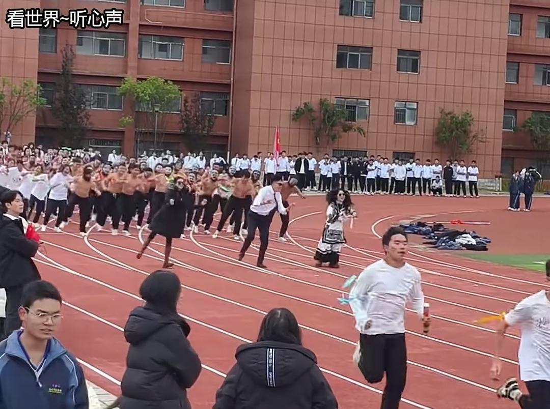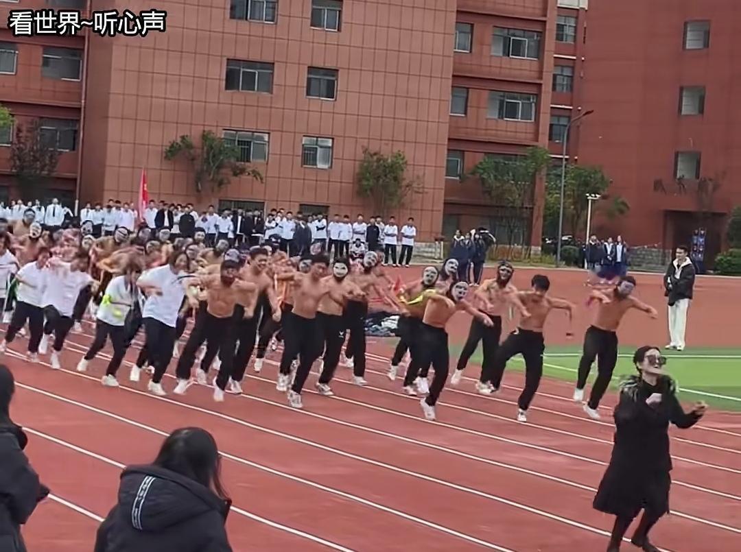舞跳得着实不错,尽显青春活力,然而让部分同学戴上画具,这场表演便有些变味了! 今日刷到一个视频,画面里一群学生跟着领舞跳着类似蹦迪舞的舞蹈,也可称作蹬腿舞,动作是单脚提起跳跃,另一只脚用力蹬地。看得出,学生和老师都沉浸在这舞蹈的欢快氛围中。但令人费解的是,领舞者的穿着以及部分男生所戴的面具,着实让人感到惊悚,那场面宛如日本的大神舞。 尽管画面中难以看到中文标识,但从人物的黄皮肤脸型、用普通话播报的年级出场顺序,还有男生们赤膊上身的模样,不难判断这应该是本地的活动。他们想要展现激情本是好事,可为何要戴吓人的面具呢?有知情的网友,能说说这究竟是怎么回事吗?