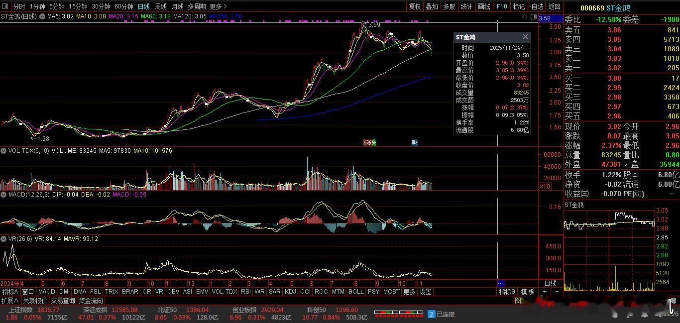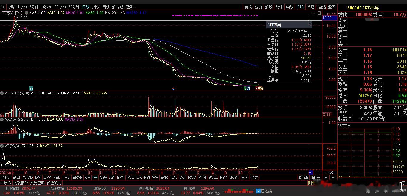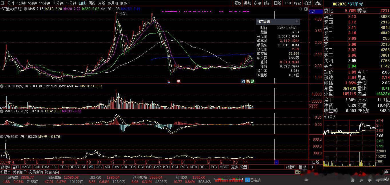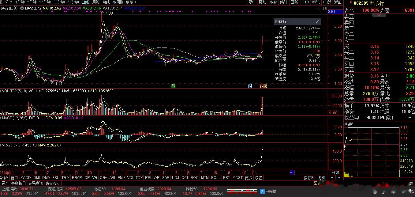 【财富晚茶】三元股市收评:沪指涨0.05%:兵装强势上扬消费探底导语:作者系《网易号》优质财经领域创作者。曾经原创作者和知名网易号旅游领域创作者。大跨度行业等的写作,颇受网友喜爱。作品发表于2025.11.24.15:18优雅端庄晚风。(标题照片:全球最佳地面兵装:第一名美国陆军地面兵装)一、*ST星光:八年筑底002076 *ST星光 盘中01涨1、八年筑底:底部突破今日视野:前期双底:触底启航。2025-11-24 截止15:00:收盘股价:2.09元,上涨1.95%。成交总量:351939手。成交金额:7329万元。总换手率:3.38%。总市值达:21.76亿元,流通市值:21.76亿元。2、汽车照明:锂电设备主营业务:LED照明-紫外消杀-汽车照明-锂电池生产设备研产和销售。公司品牌:光科技应用-锂电池头部企业。3、营收良好:净利减亏业绩盈亏:2025-09-30 三季度报:公司营收:1.6865亿 同比增36.04%,实现净利润320.2526万 同比增256.29%。二、多空搏杀:沪深红盘1、追踪盘面:蛛丝马迹。沪深场景:早盘:高开四跌,三涨五跌。午盘:五涨二跌,二涨一跌。尾盘:冲顶回落,中位红盘。看点之一:沪深股指:股指高开:瞬间回落。午后强势:震荡回升,沪指翻红。看点之二:创指走强:小幅走高。看点之三:沪深北市:合计成交:17405亿元。场内个股:4228股飘红。2、板块涨跌:风口依然涨跌观察:板块见证。板块拉升:兵装、军工等。板块走低:消费、保险、银行、煤炭等。板块走强:传媒、建筑、半导体、医药等。概念活跃:军贸、商业航天、AI应用等。3、技术看盘:涨跌位置观K线提示:精彩多空博弈。沪深两指预测:11月25日:沪指突破阻力:03854点看涨,前程似锦;跌破支撑位:03816点看跌,日暮途穷。深指突破阻力:12655点看涨,鹏程万里;跌破支撑位:12448点看跌,不堪造就。三、三元板块:风口潜水1、追踪盘面:视角视野三元超跌反弹,沪深高开杀跌。76股上涨,涨幅5%以上:4股涨停板。30股下跌,跌幅5%以上:3股跌停板。涨幅0%:0股17停板。涨幅0.00%+上涨个股:17+76=93股票赚钱。沪深两市:合计成交17405亿元。总体归纳:三元股票:盘口强势。2、追踪盘面:主力进退换位思考:沪深强势,尾盘兑现。沪指距9:31-15:00:前2小时放量盘跌,中1小时略量盘升,后1小时略量盘跌。深指距9:31-15:00:前2小时放量盘跌,中1小时略量盘升,后1小时略量盘跌。沪深两市:合计成交:17405亿元。四、透析个股:聚焦涨跌1、涨幅榜眼:处排查摸主旋律:涨幅榜之中:寻找启动002285 世联行 600200 *ST苏吴 000669 ST金鸿涨幅榜-1:002285 世联行主营业务:房地产营销顾问代理机构。公司品牌:中国城市空间集成服务商。涨幅榜-2:600200 *ST苏吴主营业务:药品研产和销售。公司品牌:高端仿制创新药领域CDMO核心能力和头部企业。涨幅榜-3:000669 ST金鸿主营业务:天然气。公司品牌:国内最具实力的综合性清洁能源服务商。2、跌幅榜眼:处排查摸主旋律:跌幅榜之中:寻找金子300477 ST合纵 600340 华夏幸福 300379 *ST东通跌幅榜-1:300477 ST合纵主营业务:配电变电控制设备-锂电池正极前驱体研造和销售。公司品牌:一流配电智慧能源领域系统解决方案服务商和先进锂电池材料前驱体供应商。跌幅榜-2:600340 华夏幸福主营业务:产业新城-商业地产。公司品牌:中国产业新城服务商。跌幅榜-3:300379 *ST东通主营业务:基础软件中间件产品的研造和销售。公司品牌:中国中间件领导者大安全信息提供商。3、潜力榜眼:处排查摸主旋律:潜力榜之中:寻找估值002496 *ST辉丰 300301 *ST长方 000669 ST金鸿潜力榜-1:002496 *ST辉丰主营业务:生物农资-农资电商-石化仓储供应链-项目投资。公司品牌:中国领先亚临界小分子高温裂解工艺高科技专利产品和头部企业。潜力榜-2:300301 *ST长方主营业务:LED照明光源器件。公司品牌:LED照明光源器件头部企业。潜力榜-3:000669 ST金鸿主营业务:天然气。公司品牌:国内最具实力的综合性清洁能源服务商。五、本创作者:优质网易投资投机迷茫之中:给予尽可能有帮助:资本市场风险自负。(优雅端庄晚风《网易号》优质财经领域创作者和原创作者; 违者必究)