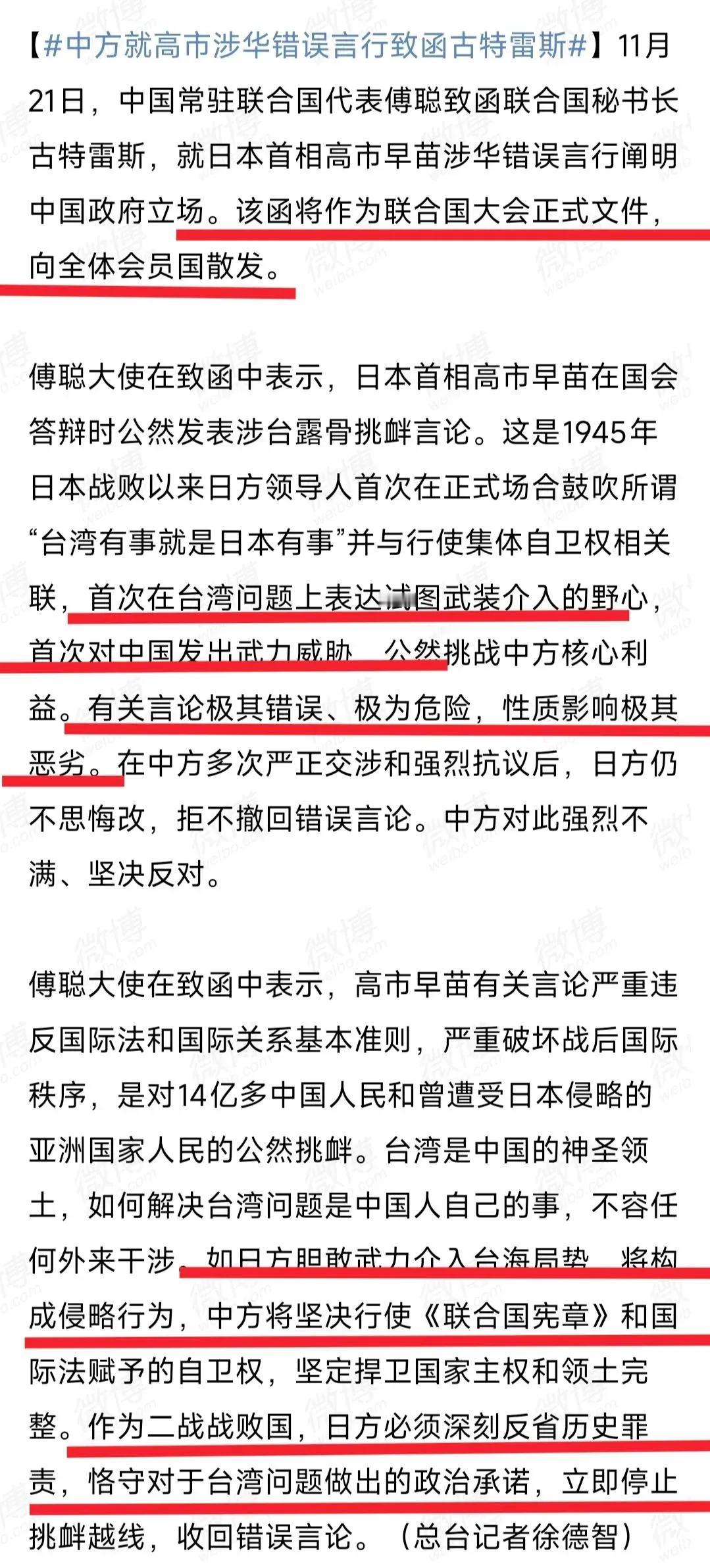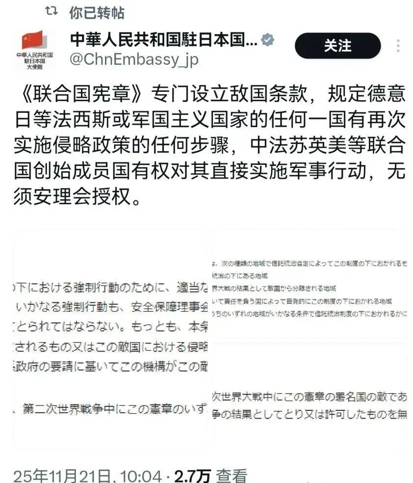 新加坡联合早报今天(11月24日)报道:“中国驻日本大使馆引用《联合国宪章》,指对法西斯国家动武无须安理会授权,暗指可直接对日本动武,日本外交部回应称,中国发布暗示过时条款仍在生效的信息,与联合国既定决议相悖。” 30年来日本政府一直在误导日本民众,《联合国宪章》中“敌国条款”已经被删除,混淆联合国建议与安理会决议的关系。1995年12月,第50届联合国通过建议删除“敌国条款”的第52号决议,但修改《联合国宪章》的权力在安理会。由于当时日本政客也包括高市早苗等结队参拜靖国神社、否认侵略历史并修改历史教科书等等原因,不思悔改、反省日本侵略历史所犯罪行,因此未提交安理会进行表决,“敌国条款”至今未予废止。中国驻日大使馆11月21日发文提醒日本政府及国民(图3),勿忘记日本二战战败国的身份,如果日本有再次实施侵略政策的任何步骤,联合国安理会常任理事国有权对其直接实施军事行动,无须安理会授权。
