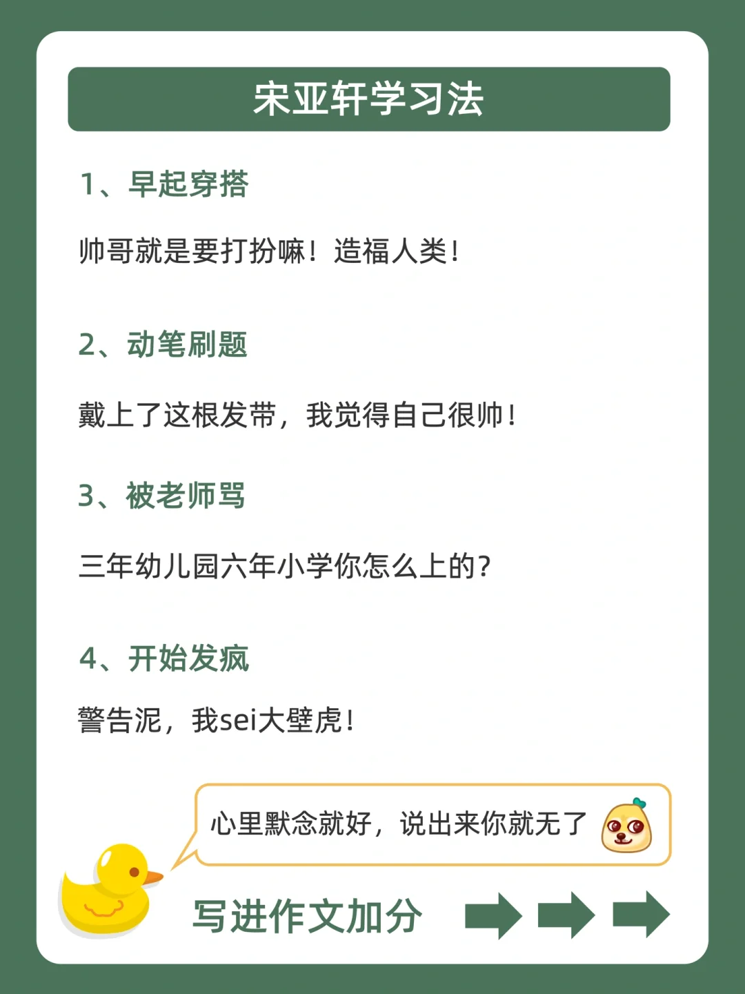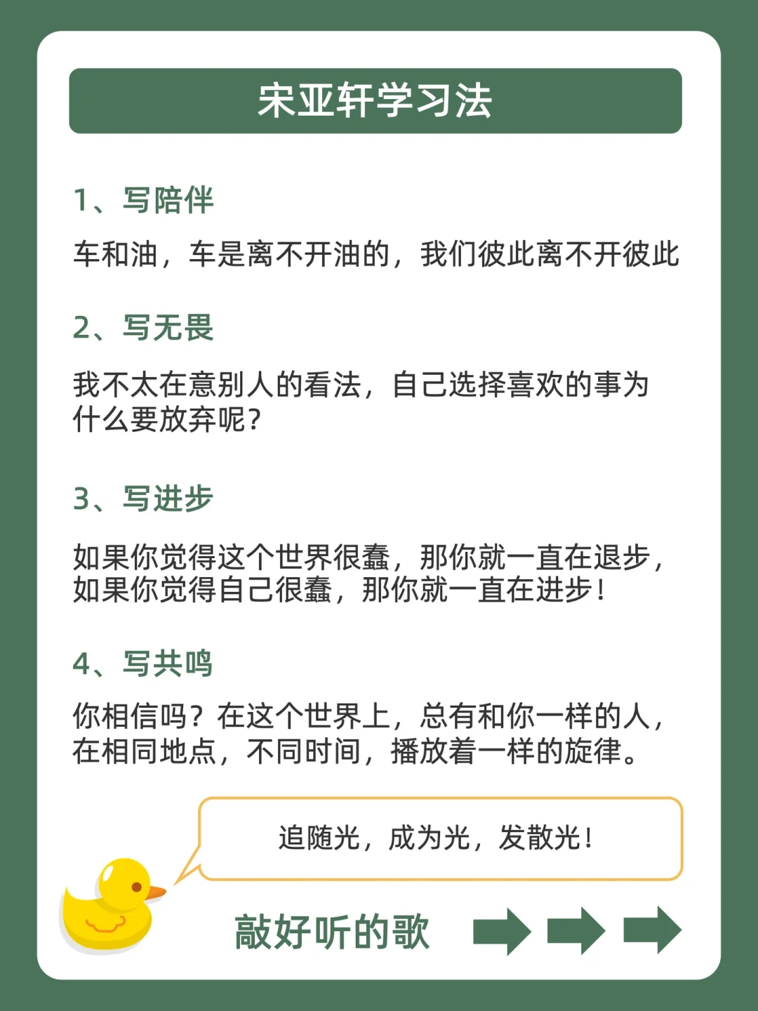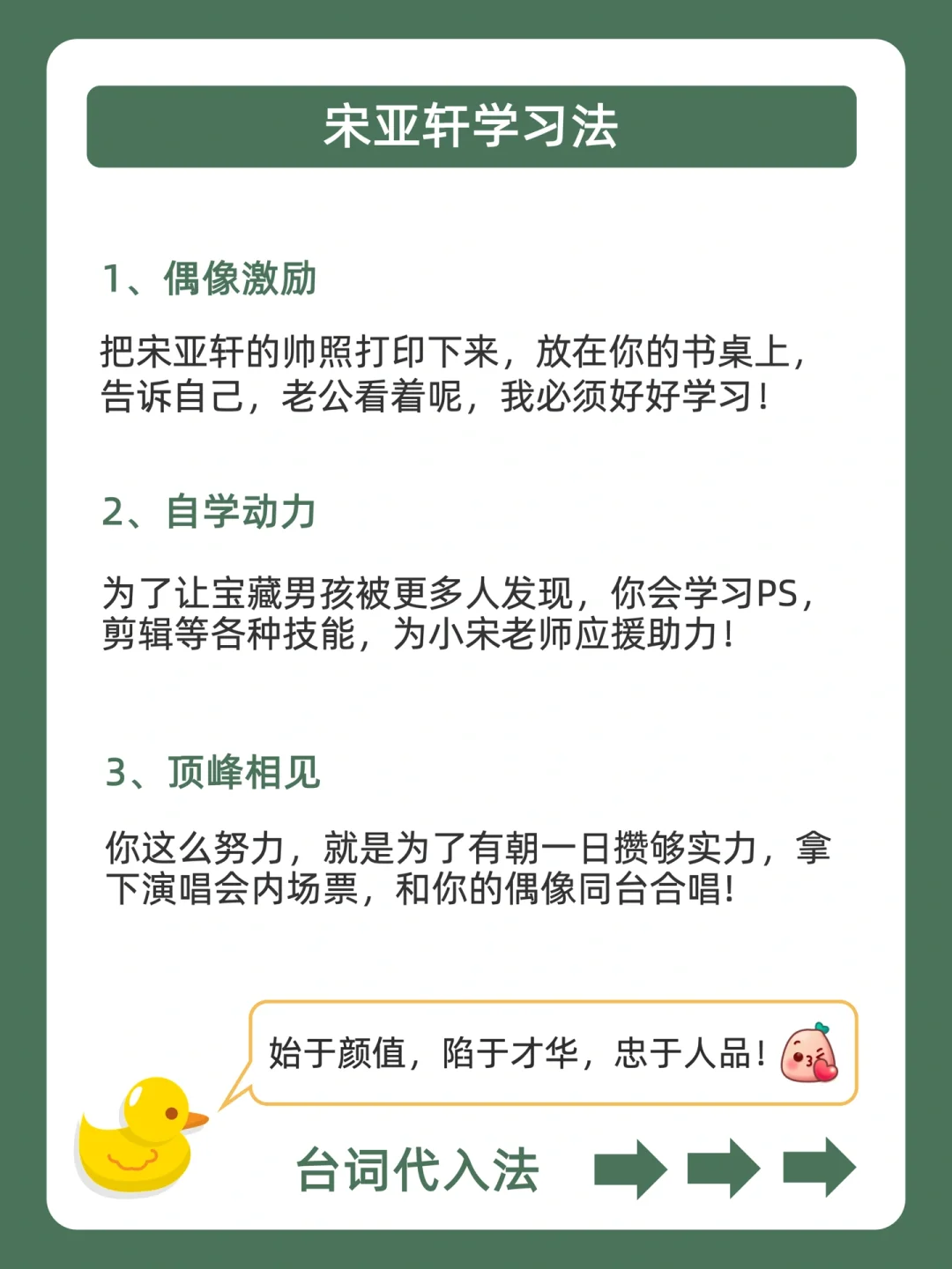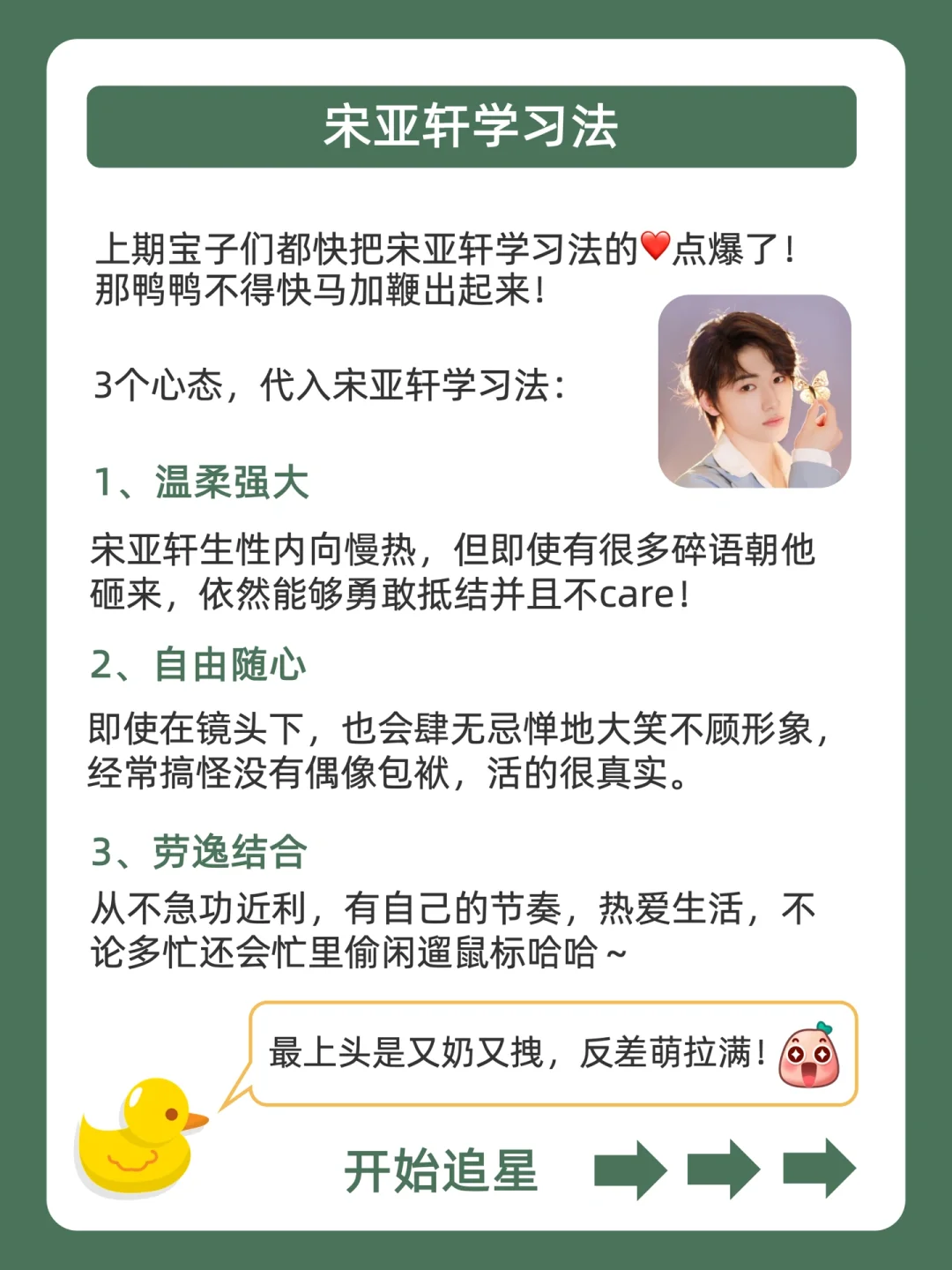 . [赞R]用学习方法帮你变成学霸,是鸭鸭的责任❗ . [向右R]上期投大家呼声最高的是宋亚轩学习法![哇R] . [点赞R]鸭鸭这么宠粉,投稿和建议都会认真对待的哇![飞吻R] . 今天就来分享,宋亚轩学习法,都在上面的图,看完就会用,从此追星学习,逆袭学霸![赞R] . 🐣我是鸭鸭,持续更新神奇学习方法,陪宝子们快乐逆袭,驰骋学海!🌊