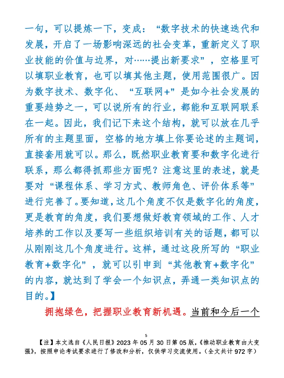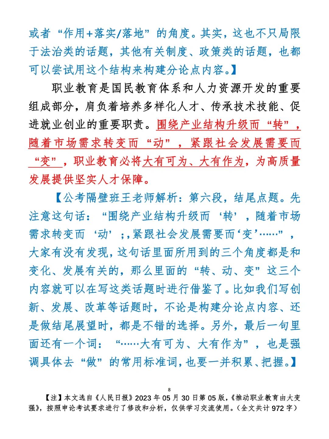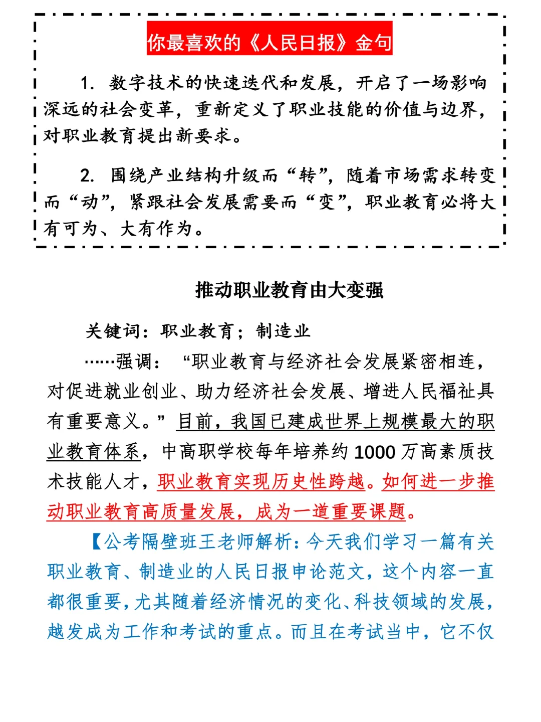 如何抄写:每日抄写文章发在“公考隔壁班王老师”账号,红色字是重点句和结构句,黑色字是正文,蓝色字是解析,大家抄写时不必抄蓝色字。建议先通读全文,做到心中有数再开始抄写,效果会更好。 关于文章:抄写文章来源于人民日报,但每篇文章我都根据申论考试要求进行了修改:一是重写或修改开头、结尾;二是统一段首句句式结构;三是调整段落字数,使文章结构更均衡;四是简化复杂长难句,使之更具可模仿性。每篇文章无论修改多少,都是基于申论考试要求,毫无对人民日报文章品评之意。(此处致敬人民日报)