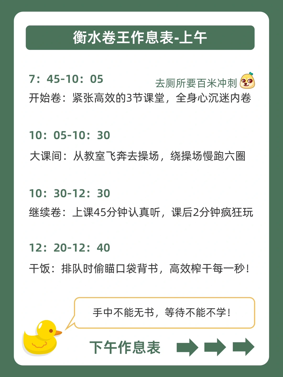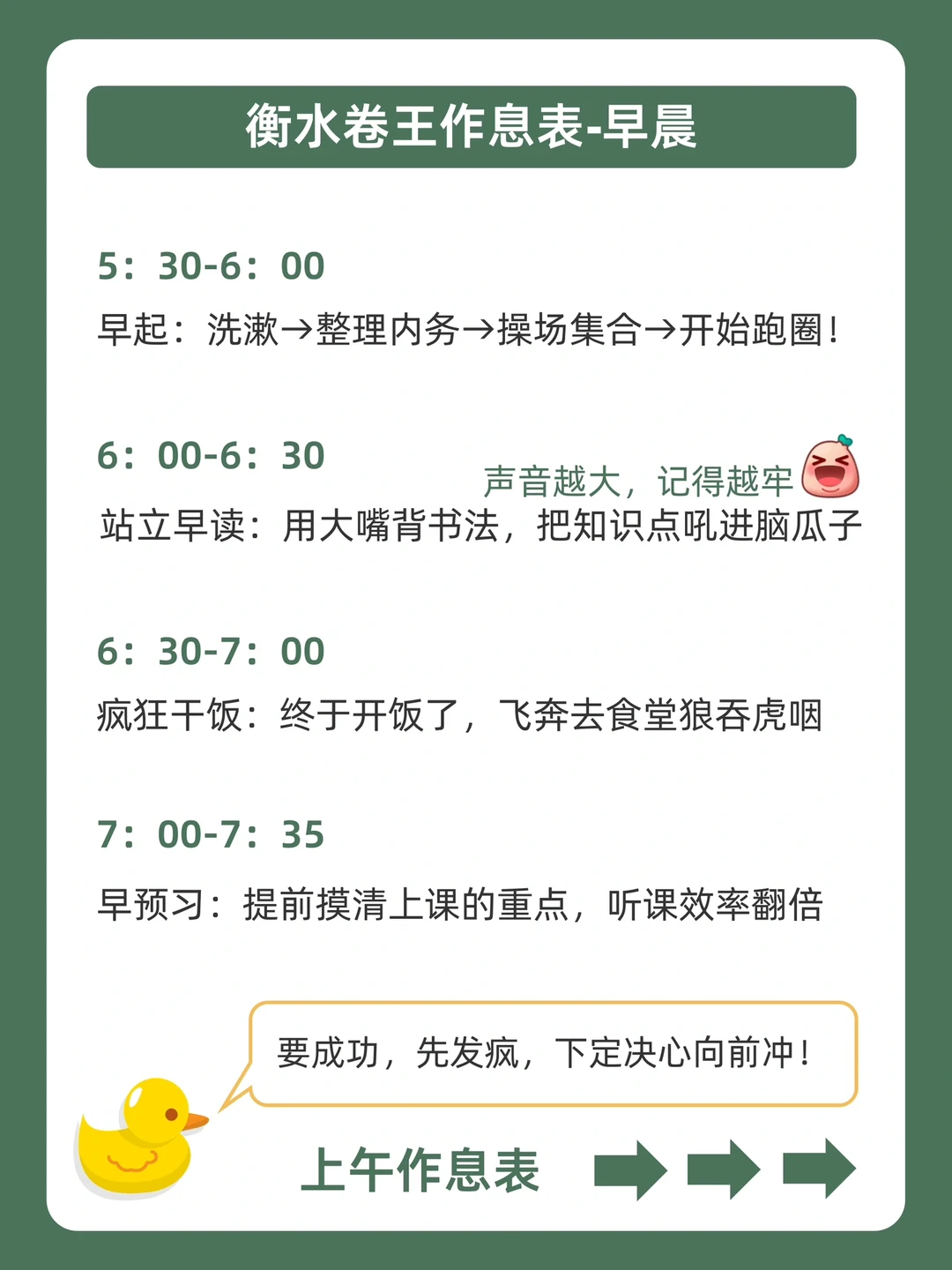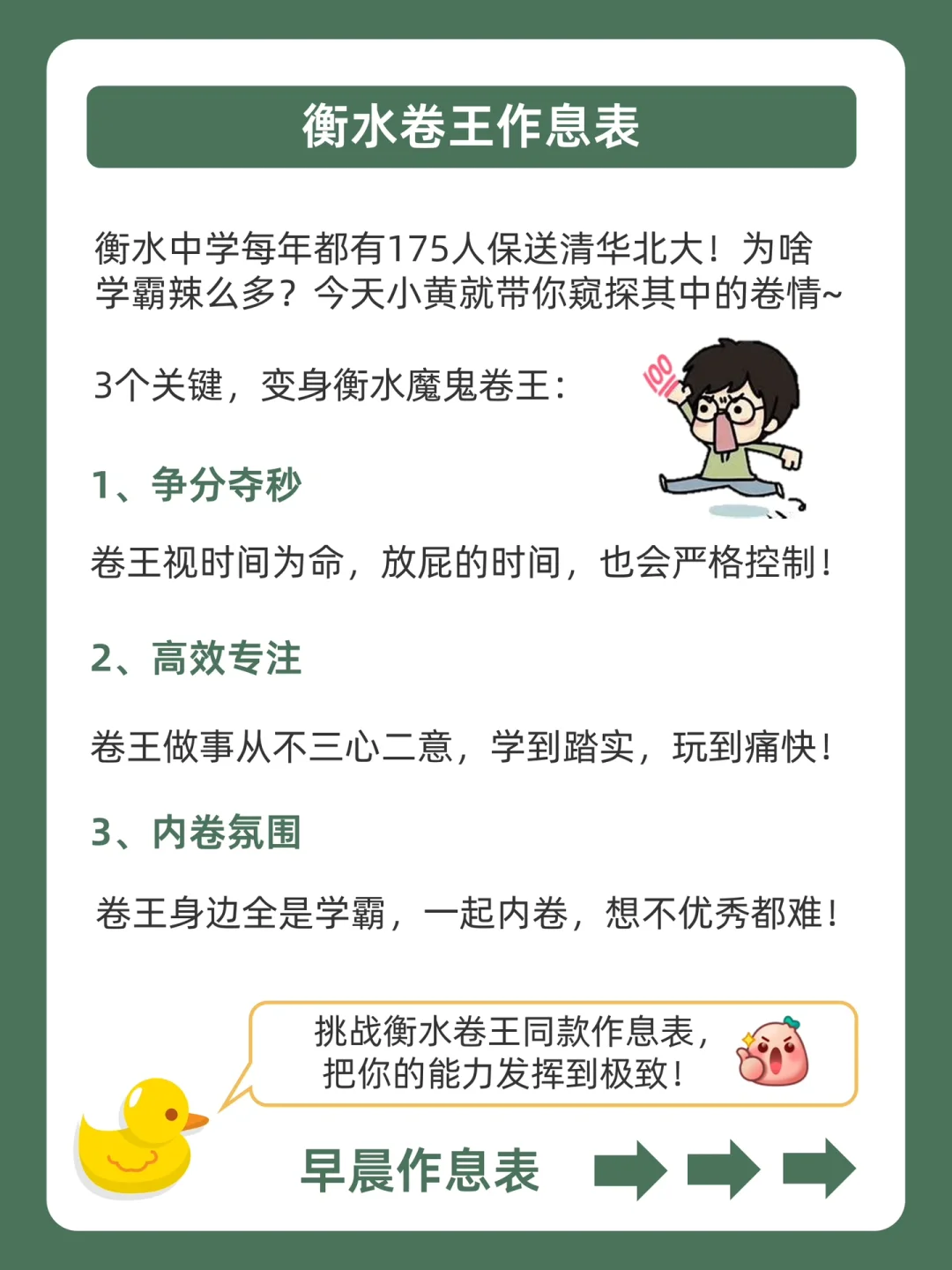 . [赞R]学习摆烂不用怕,鸭鸭带你做学霸❗ . [向右R]好多宝子投稿说想挑战一下衡水魔鬼作息表![石化R] . [点赞R]鸭鸭这么宠粉,投稿和建议都会认真对待的哇![哇R] . 今天就来分享,衡水卷王作息表+趁早效率手册,从此高效榨干24小时,逆袭衡水魔鬼学霸![赞R] . 🐣我是鸭鸭,持续更新优质学习笔记,陪宝子们疯狂内卷,校园逆袭![赞R]