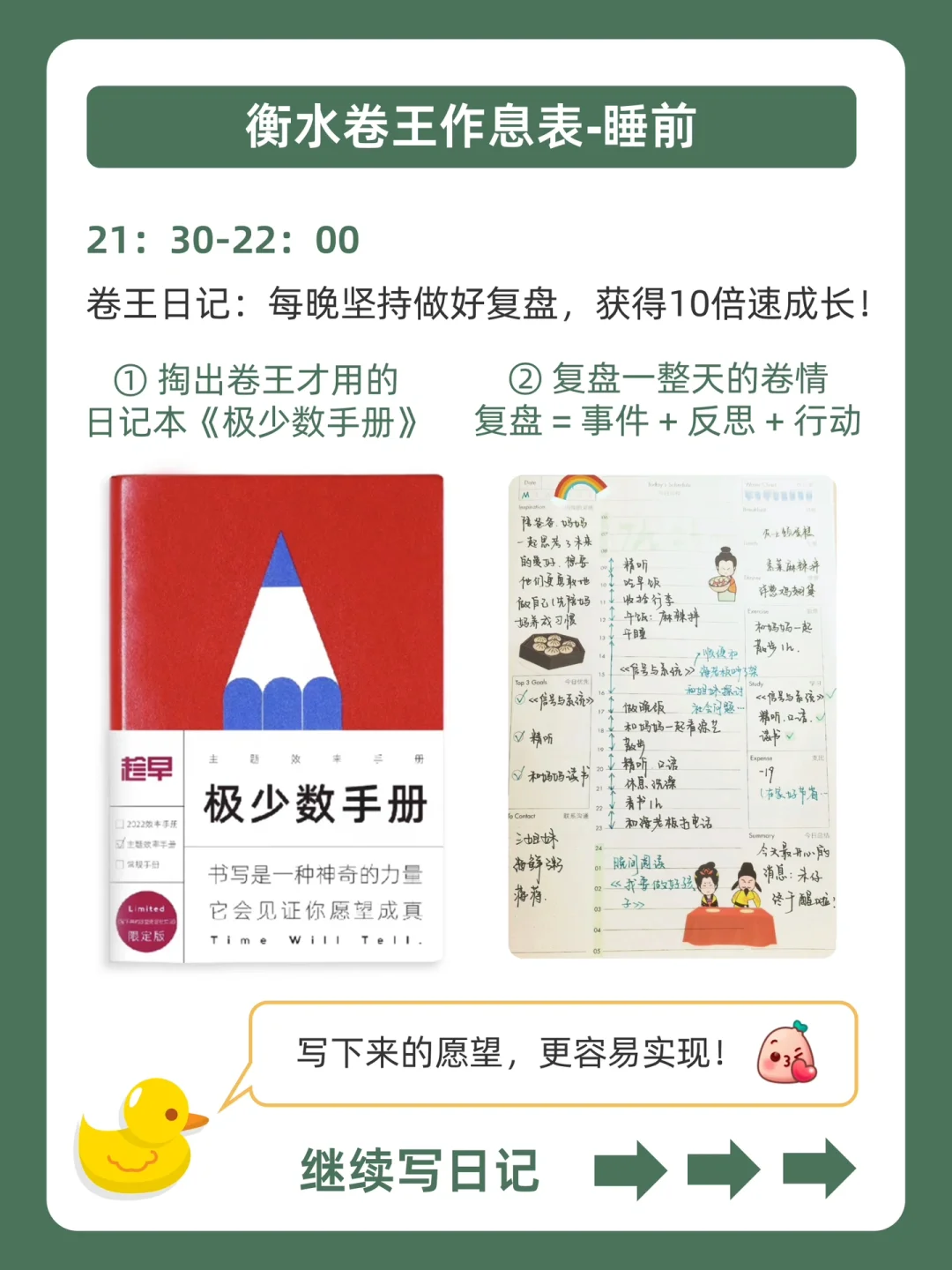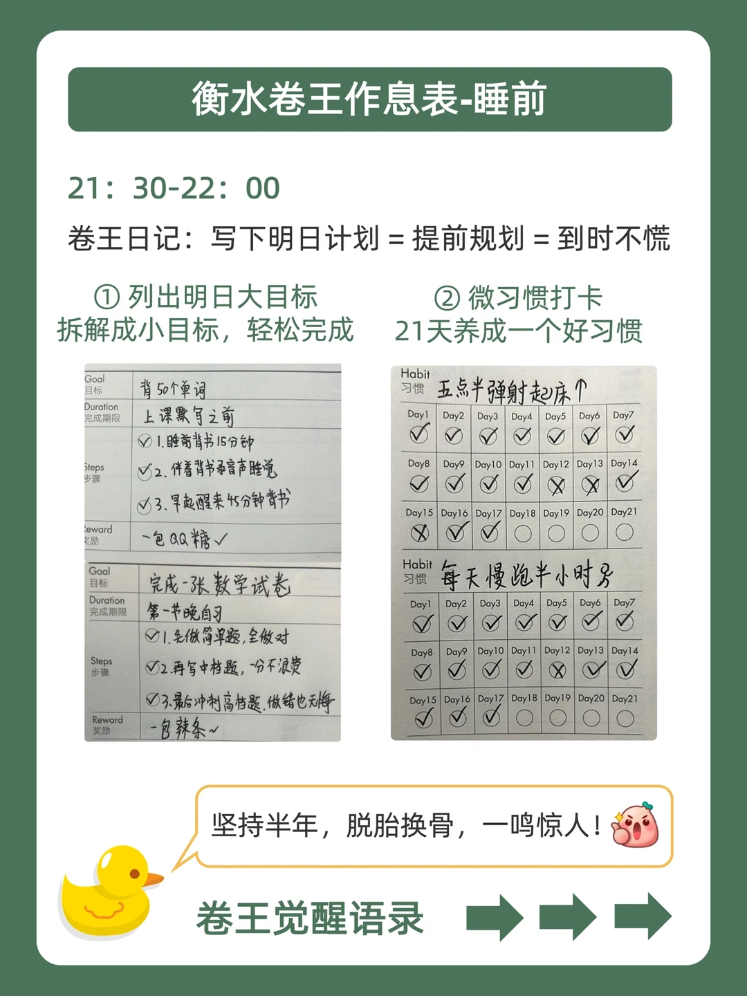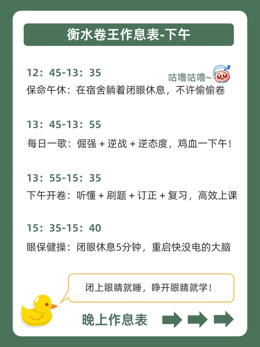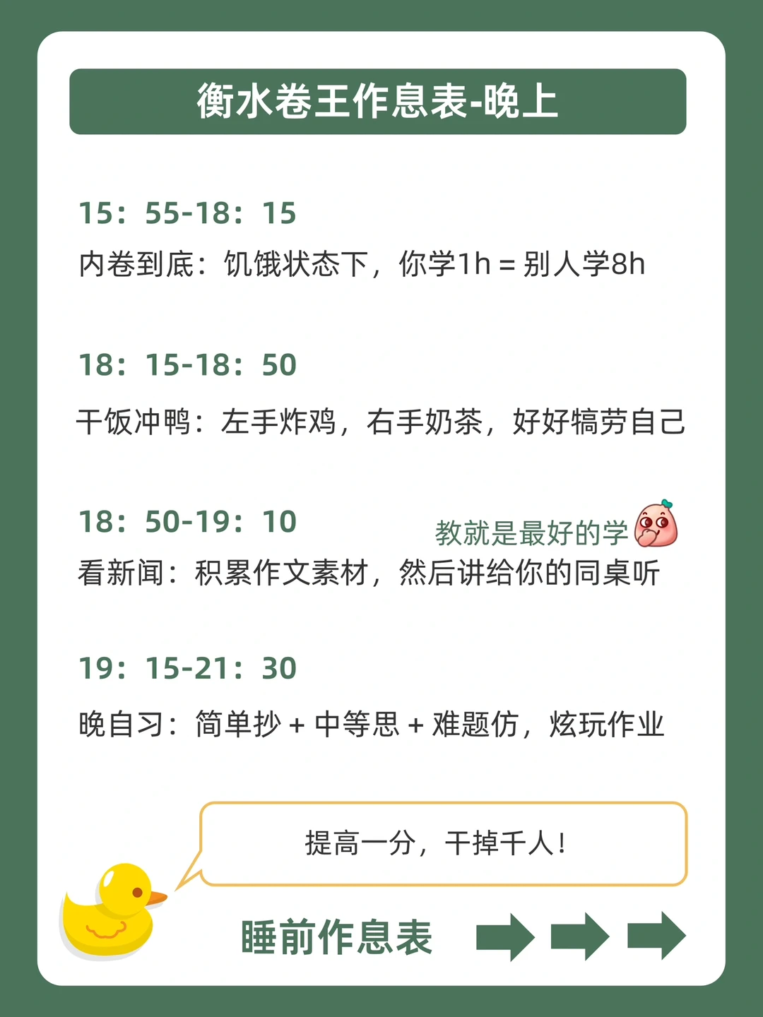 . [赞R]学习摆烂不用怕,鸭鸭带你做学霸❗ . [向右R]好多宝子投稿说想挑战一下衡水魔鬼作息表![石化R] . [点赞R]鸭鸭这么宠粉,投稿和建议都会认真对待的哇![哇R] . 今天就来分享,衡水卷王作息表+趁早效率手册,从此高效榨干24小时,逆袭衡水魔鬼学霸![赞R] . 🐣我是鸭鸭,持续更新优质学习笔记,陪宝子们疯狂内卷,校园逆袭![赞R]