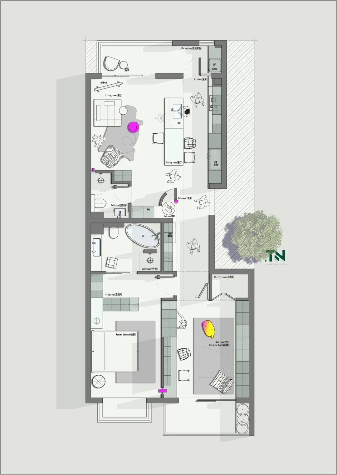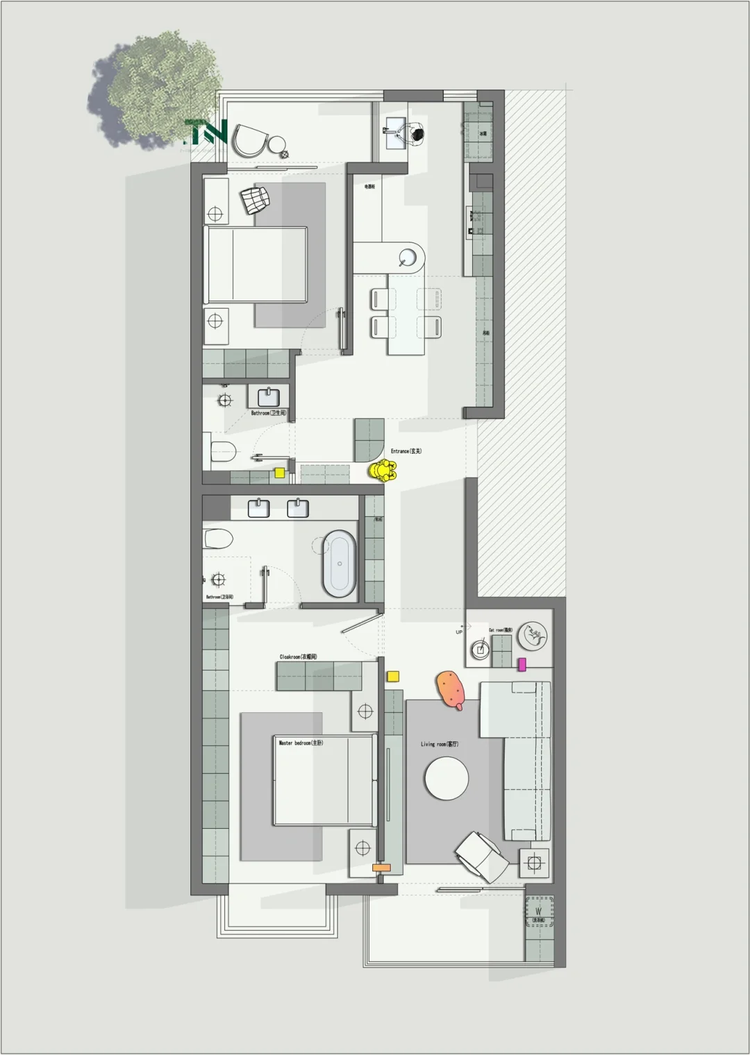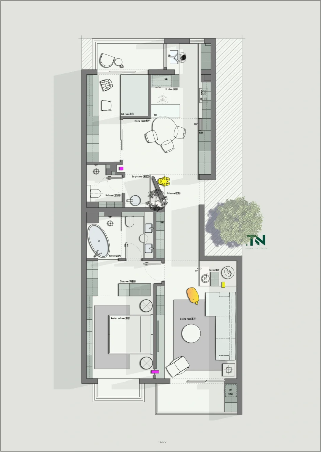 设计需求: 1、一对年轻夫妻 2、需要主卧套间、一个客房、猫窝 3、需要餐厨一体 4、主卫要求有浴缸