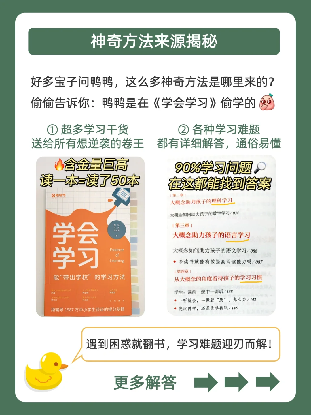 . [向右R]有宝子说学习好痛苦,特讨厌学习不知道咋办![石化R] . [点赞R]鸭鸭这么宠粉,投稿和建议都会认真对待的哇![哇R] . 今天就来分享,无痛学习法,搭配一本「小橙书」:猿辅导重磅出品的《学会学习》,从此快乐学习,高效逆袭![赞R] . [向右R]偷偷告诉你,超多的猿辅导学员,都用过这里的学习方法,你还不来看看吗?[偷笑R] . 🐣我是鸭鸭,持续更新神奇学习方法,陪宝子们快乐学习,驰骋学海!🌊