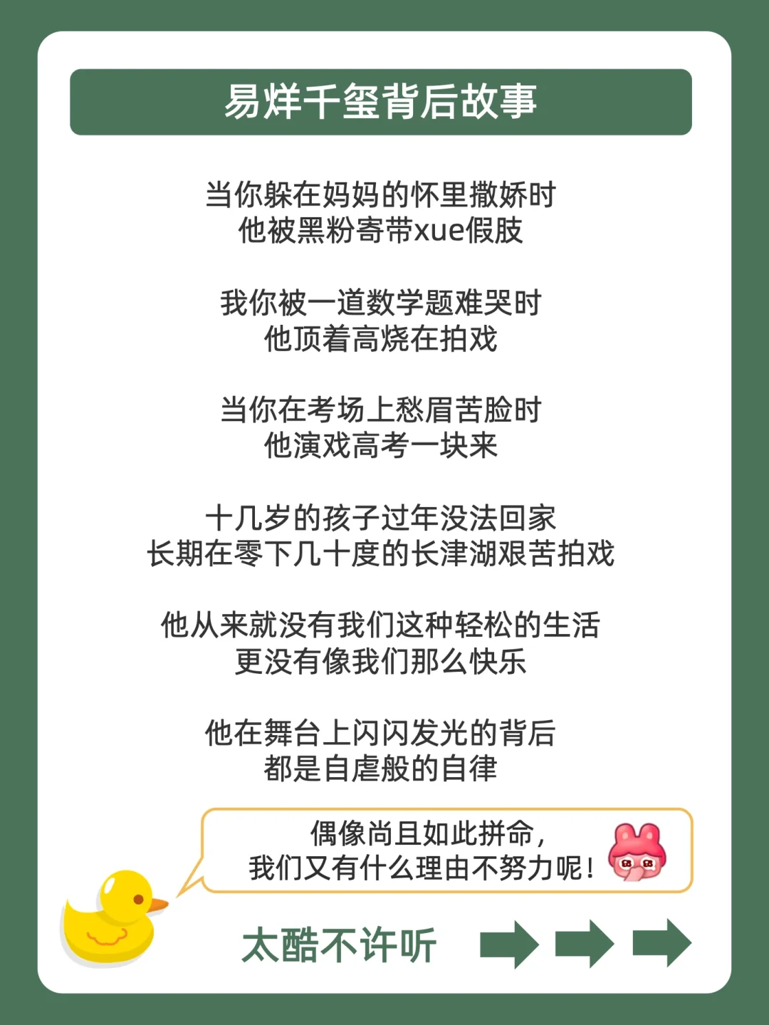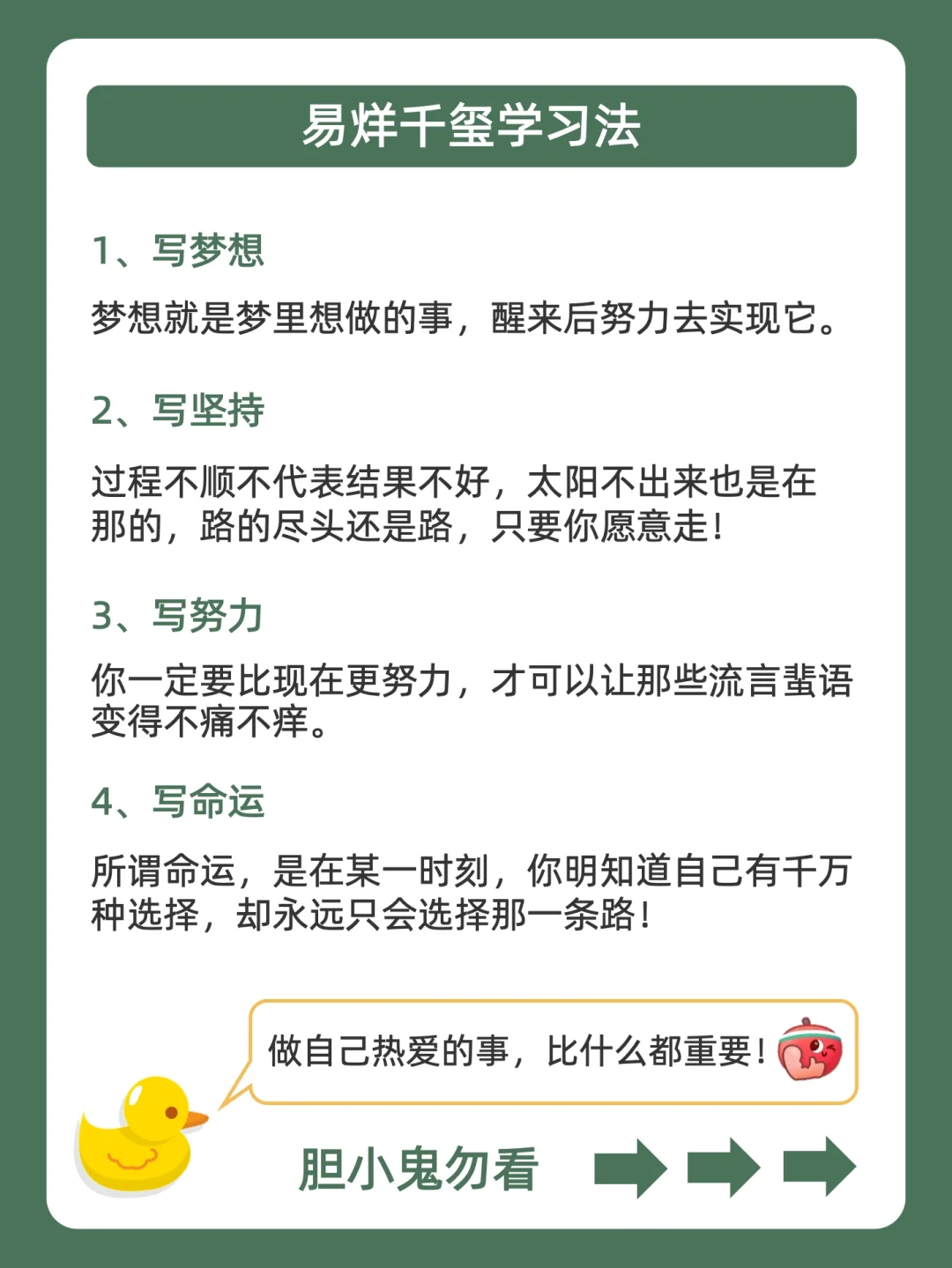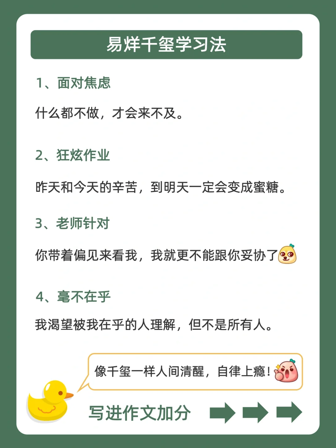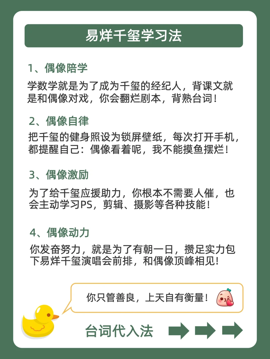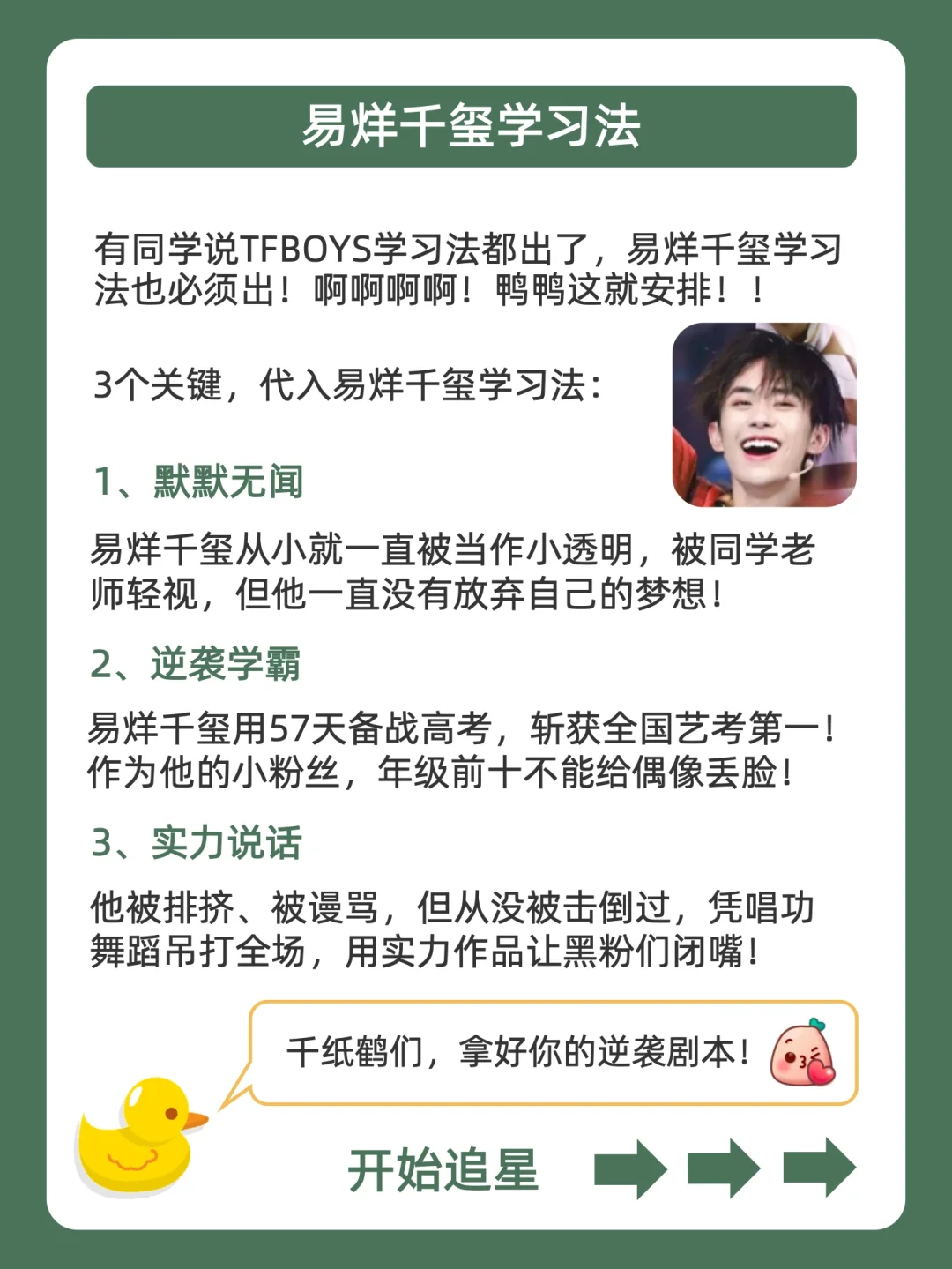 . [赞R]用学习方法帮你变成学霸,是鸭鸭的责任❗ . [向右R]有宝子说TFBOYS学习法都出了,易烊千玺学习法也必须麻溜地出![斜眼R] . [点赞R]鸭鸭这么宠粉,投稿和建议都会认真对待的哇![哇R] . 今天就来分享,易烊千玺学习法,都在上面的图,看完就会用,从此追星学习,偷偷逆袭![赞R] . 🐣我是鸭鸭,持续更新神奇学习方法,陪宝子们快乐逆袭,驰骋学海!🌊