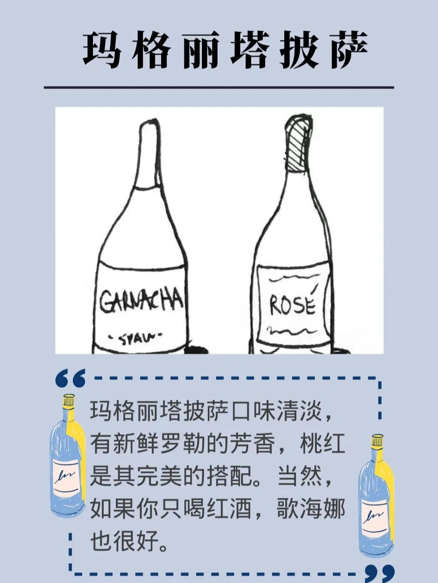 🍱理由: 玛格丽塔披萨口味清淡,有新鲜罗勒的芳香,桃红是其完美的搭配。当然,如果你只喝红酒,歌海娜也很好。