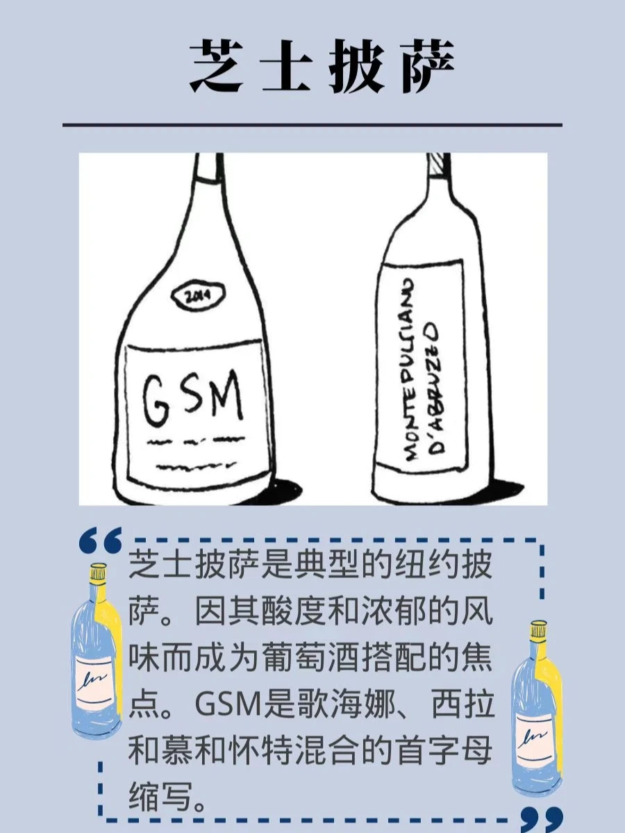 🍱理由:芝士披萨中的番茄酱的酸度和强烈味道是搭配的焦点。(GSM是歌海娜Grenache、西拉Syrah和Mourvèdre的缩写)。