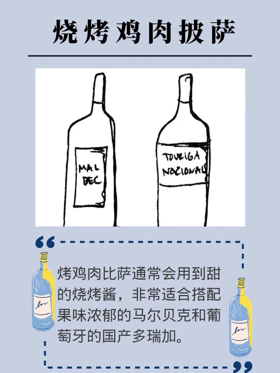 🍱理由:烤鸡肉比萨通常会用到甜的烧烤酱,非常适合搭配果味浓郁的马尔贝克和葡萄牙的国产多瑞加。