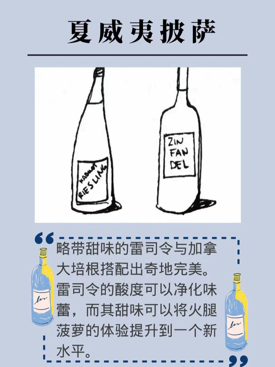 🍱理由:略带甜味的雷司令与加拿大培根搭配出奇地完美。雷司令的酸度可以净化味蕾,而其甜味可以将火腿菠萝的体验提升到一个新水平。果味更浓郁或更甜的红酒,比如仙粉黛也是不错的选择。