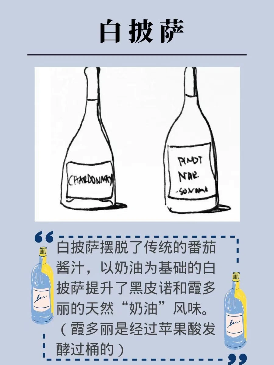 🍱理由:白披萨摆脱了传统的番茄酱汁,以奶油为基础的白披萨提升了黑皮诺和霞多丽的天然“奶油”风味。(霞多丽是经过苹果酸乳酸发酵的过桶霞多丽)
