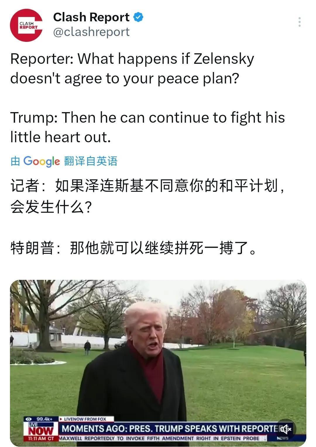 特朗普今天(北京时间11月23日)再次谈到泽连斯基和新和平计划。记者:如果泽连斯基不同意你的和平计划,会发生什么?特朗普:那他就可以继续拼死一搏了。 基辅市中心的独立广场上,寒风卷着枯叶掠过征兵海报,海报上士兵的眼神模糊——那是半年前还在宣传“保卫家园”的同款设计,如今下面多了行小字:“60岁以下公民均有服役义务”。 “拼死一搏”四个字从特朗普口中吐出时,像一把冰锥,刺破了泽连斯基办公室里还没来得及撤下的“美国盟友”锦旗。 两年前,这位乌克兰总统穿着军夹克在国会演讲,身后大屏幕播放着被炸的居民楼,台下掌声雷动,拜登当场承诺“美国将永远站在你这边”。 现在,“永远”的期限似乎到了。特朗普的新和平计划细节未公开,但“不同意就继续打”的潜台词,比任何条款都更锋利。 卢比奥去年在参议院听证会上的发言突然被翻了出来:“乌克兰重建?当然,美国企业应该拿到至少一半合同。”——原来战争的账本,早就在华盛顿算好了。 有人说这是国际政治的常态,没有永恒的朋友只有永恒的利益——可当“朋友”把你的国土当棋盘、把你的人民当棋子,这样的“常态”是否早已越过底线? 乌克兰的年轻人在顿巴斯的战壕里冻得瑟瑟发抖时,美国军工股的K线图正在创新高;基辅的医院缺医少药时,五角大楼的官员们正讨论下一批武器该涨价多少。 这种“援助”从来都不是免费的。每一笔贷款都绑定着能源开采权,每一批武器都附带优先采购协议,所谓“盟友”,不过是精心包装的债务陷阱。 泽连斯基现在的选择,比哈姆雷特的“生存还是毁灭”更残酷。同意,可能要承认领土变更;不同意,前线的兵源和弹药还能撑多久?征兵办的敲门声,已经越来越急。 短期看,这场博弈会决定敖德萨港口的控制权;长远来说,它给所有依赖外部援助的国家提了个醒:借来的火焰,既能取暖,也能烧身。 广场上的征兵海报被风吹得哗哗作响,像在重复那个无人能答的问题:如果一开始就知道结局,那些军夹克上的勋章,还值得用生命去换吗?