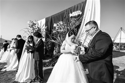 近日,浙江省诸暨市安华镇在丰江周村举办“越风有喜·诸事暨成——情定丰江甜蜜一生”为主题的集体婚礼,通过举行跨百年蔗、红绳结蔗、共饮“安华曲”等特色仪式,为新人打造既庄重又甜蜜的婚礼体验,倡导“婚事新办简办”的文明新风。图为参加集体婚礼的新人进行红绳结蔗环节,象征永结同心、甜蜜美满。甘蔗种植和古法红糖制作是丰江周村的特色产业,本次集体婚礼也融入了特色产业的元素。新华社发