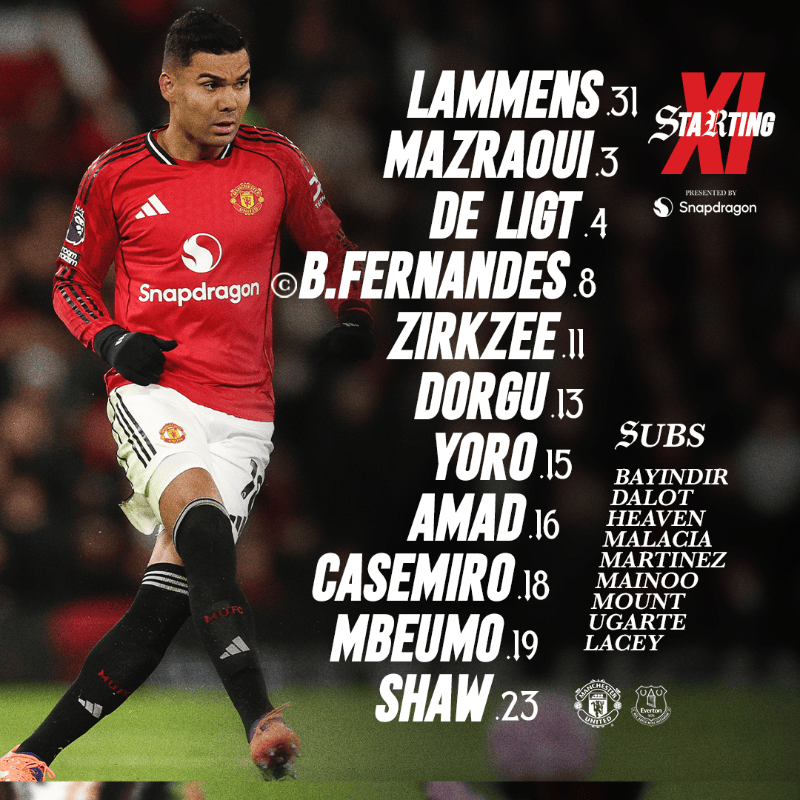 虎扑11月25日讯英超第12轮最后一场焦点赛事,曼联主场迎战埃弗顿。赛前,双方公布了本场比赛首发名单。