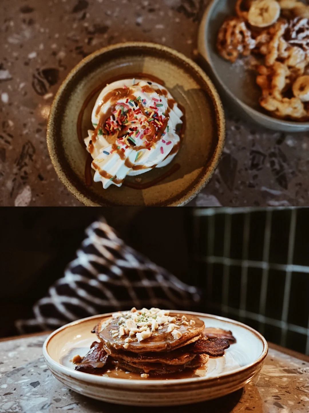 🇺🇸➕🇬🇧我和朋友叫的weekend brunch 388+10% 服务费,很喜欢peanut butter pancake+Bacon的组合,原本以为有点怪,但事实上很香很顺滑,朋友说很美国很heavy的组合,怎能不好吃呢?大虾🍤配微辣的source,很适合配合白酒的午餐。甜品Mr. Whippy ice cream, 有点像香港经典雪糕车的软雪糕,很滑很creamy, 像是奶油一般。