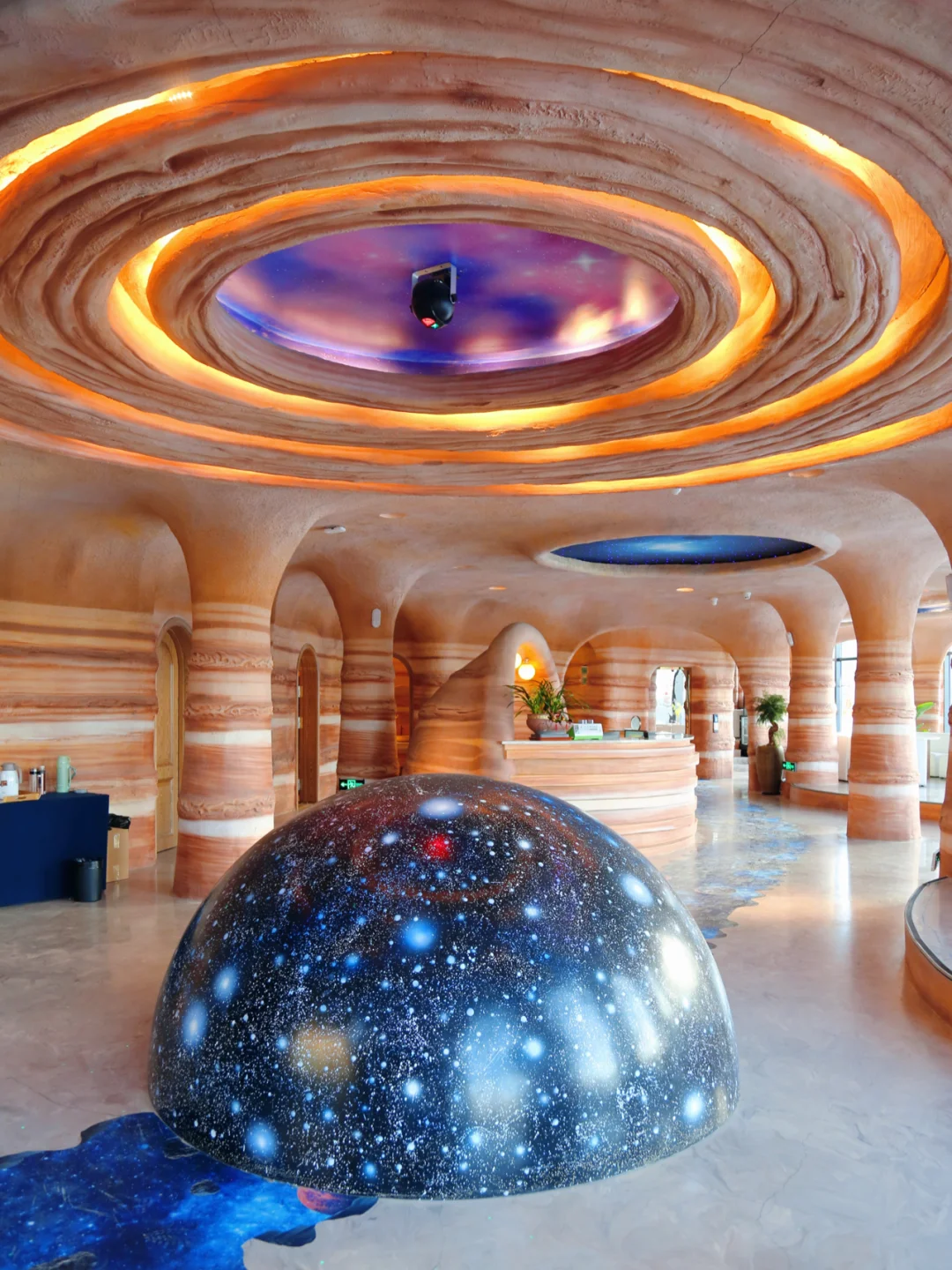 🔸100多间房,🈶️大床房、双床房、家庭房和复式套房,8大星系主题,每间房都有不一样的星空➕洞穴设计,基本每个房间都会配一个儿童小床,适合情侣或家庭出游‼️