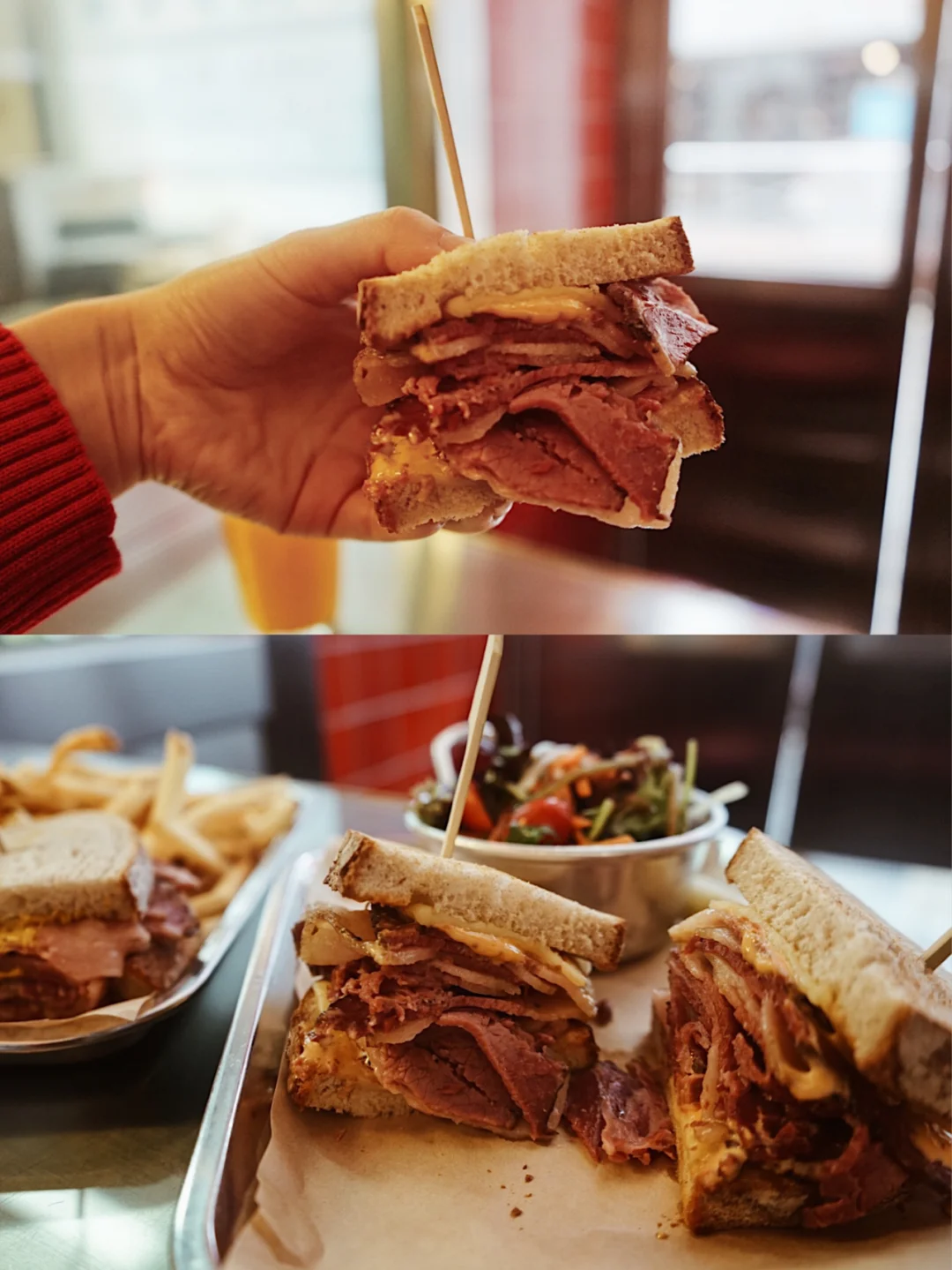 自家制的麦包,夹着层层叠叠的烟熏牛肉,加上瑞士芝士和腌酸菜,馅料真的无敌澎湃,一口咬下去,我和朋友说:这是舌尖的高潮‼️怎么可以这么好吃。