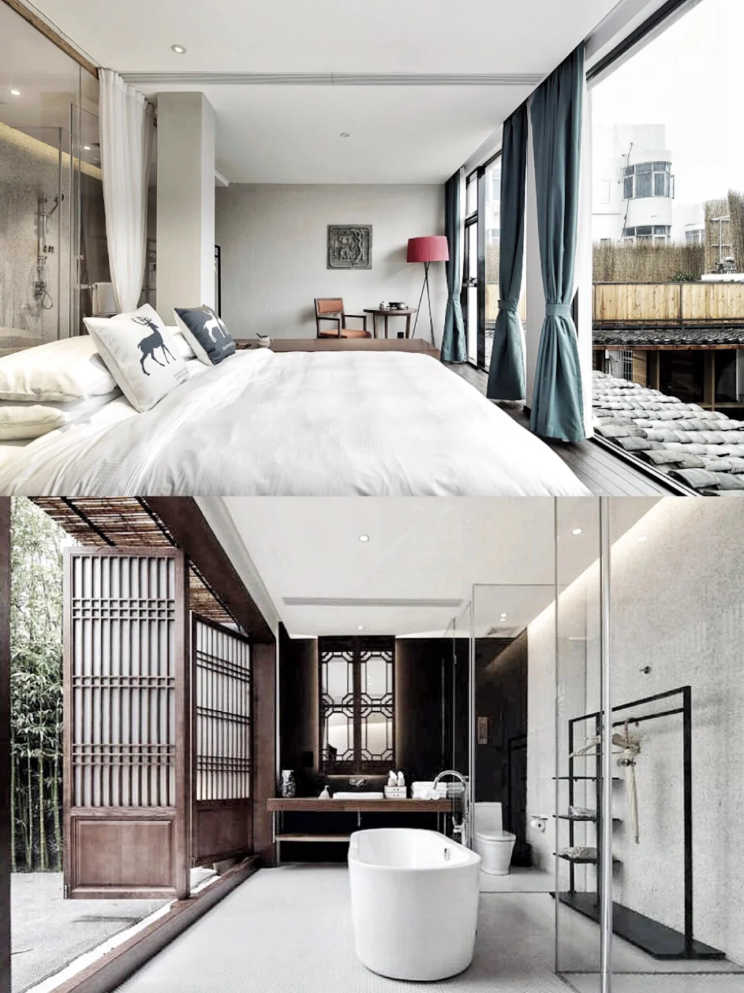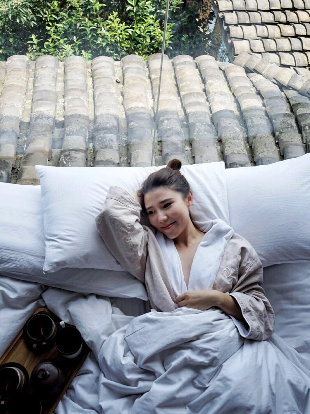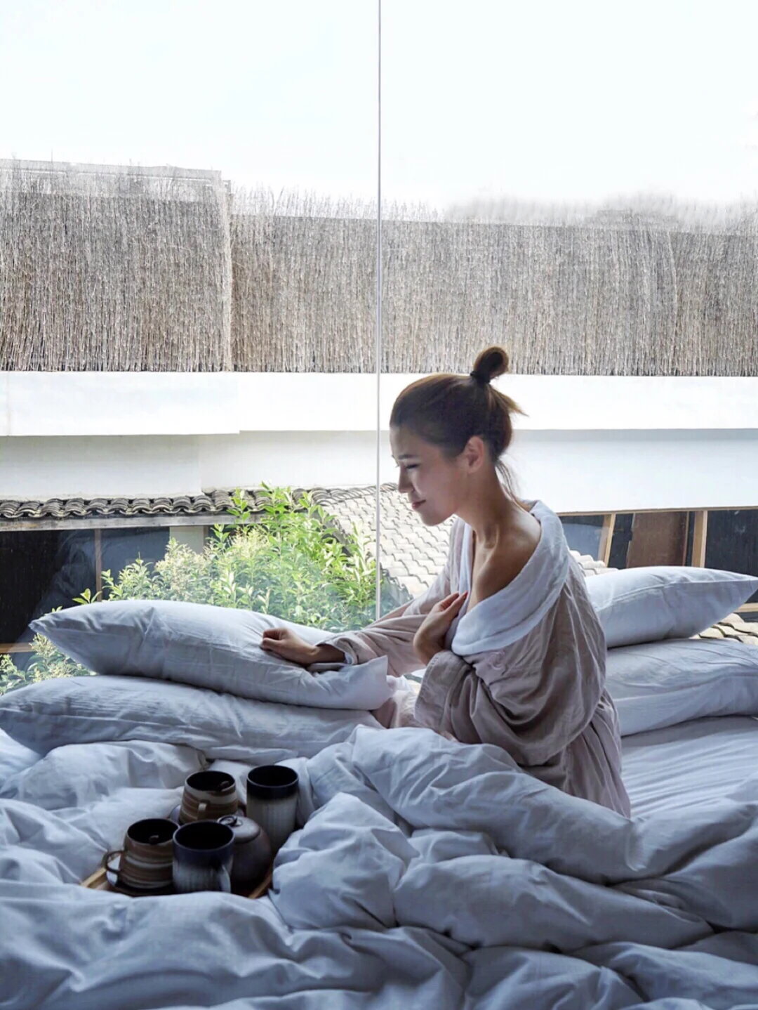 👍1⃣️:拍照勉强OK:边春房间如图8的上面👆一幅图。把床移到落地窗边上,摆上房间里就有的茶具,便可以迅速凹个做作的网红造型,如图1,2。浴袍也是民宿里有的。基本上也是因为这图才选的这家民宿。