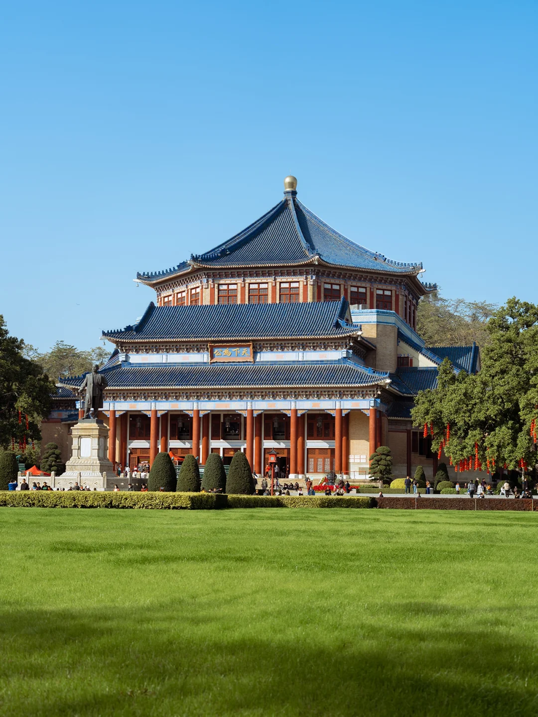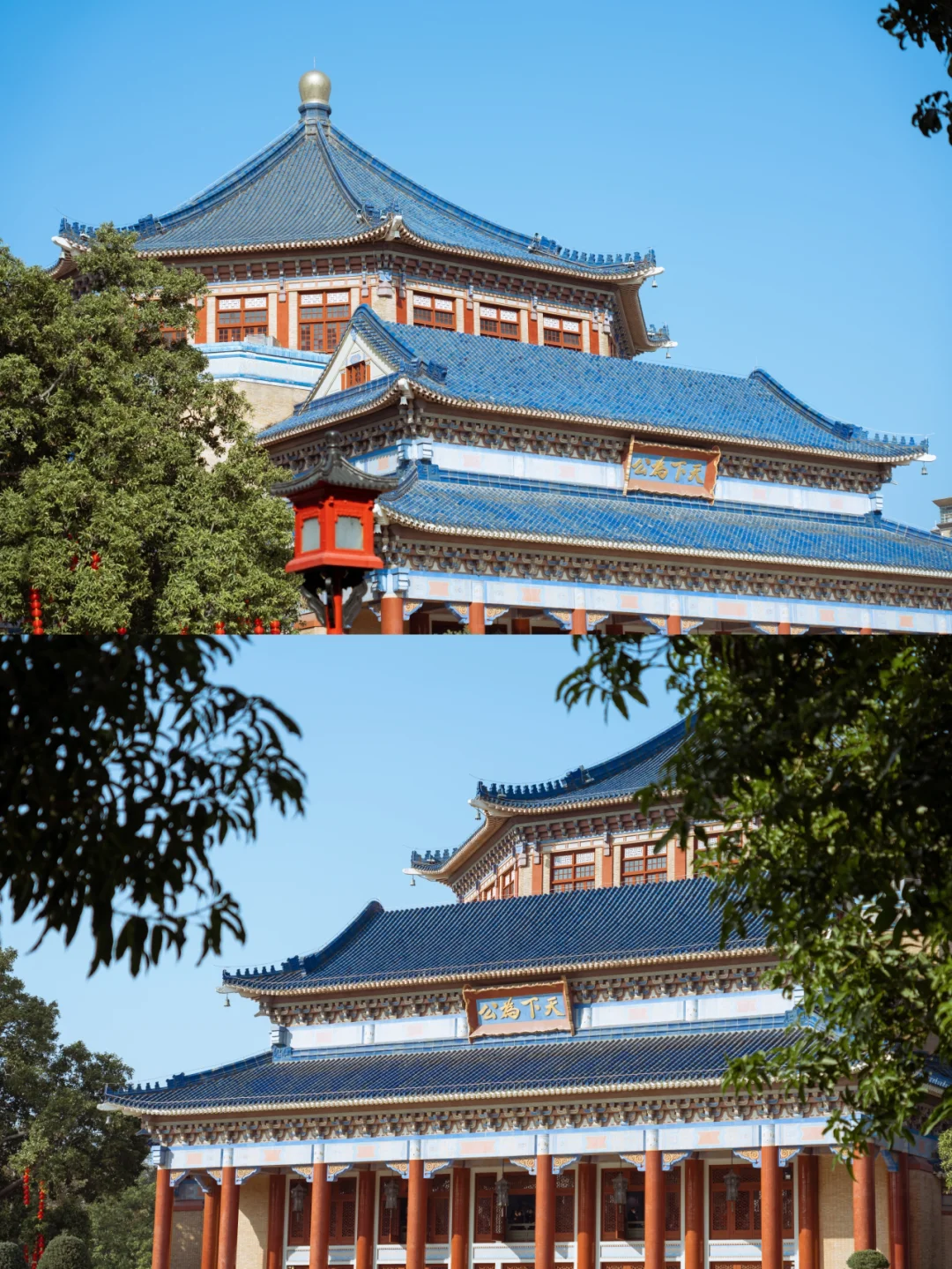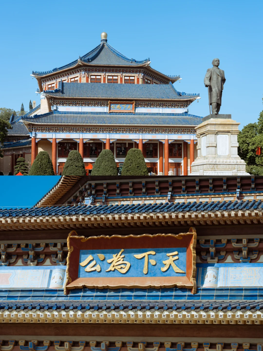 中山纪念堂于1929年1月动工,1931年11月建成。1956年,重铸的高5米的孙中山先生铜像屹立在纪念堂前。总体布局采用中国传统的宫殿式风格与近代西洋平面设计手法结合,由著名建筑师吕彦直设计。建筑面积为3700平方米,高49米,四面为4个重檐歇山抱厦,拱托中央八角攒尖式巨顶。前檐下横匾高悬孙中山手“天下为公”4个大字,雄浑有力。