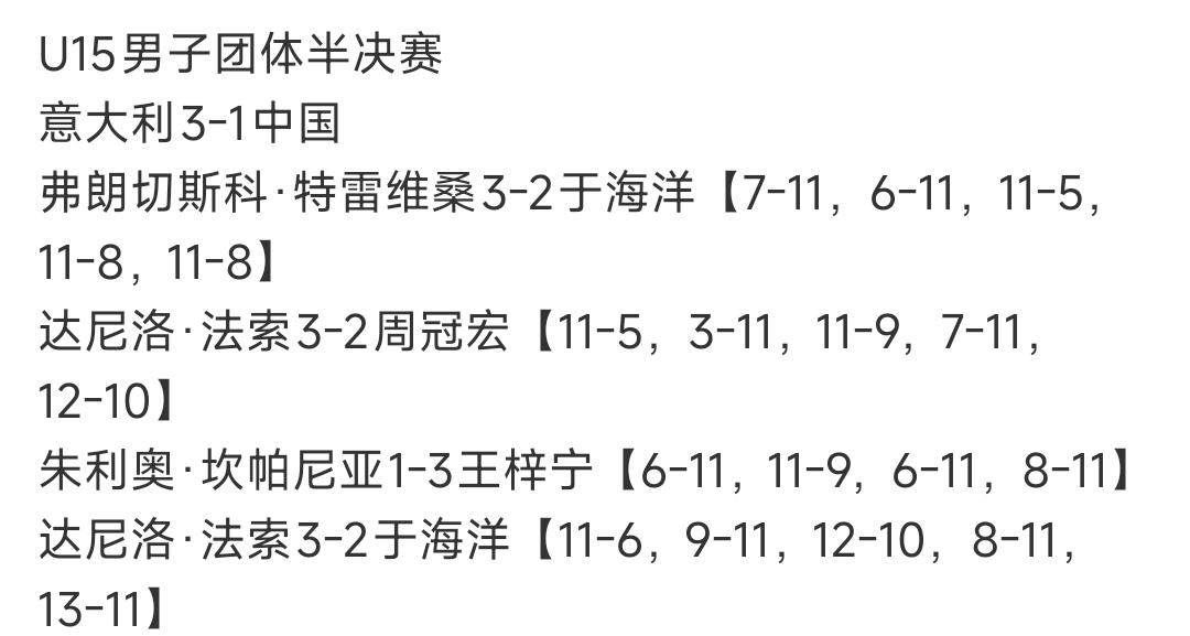 U15国乒男团无缘决赛! 2025年国际乒联世青赛 U15级别男团半决赛,国乒1比3不敌意大利无缘决赛! 国乒派出于海洋、周冠宏和王梓宁出战,仅第三盘出战的王梓宁拿到一分,于海洋一单两战皆负,周冠宏二单不敌法索! 国乒派出的也是这个级别的优秀选手,但没有优势,输给了意大利!欧洲整体实力在上升,已不是前这些年的水准了,我们仍在原地徘徊或有下降!随着U19男团未进前四,U15男团未进决赛,国乒青训出了较大问题,还是亟待重视!