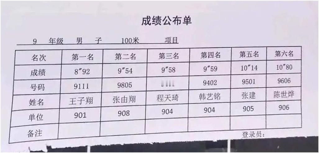 看到很多人说中学时100米能跑9秒多、10秒多,我以前不信。看到下面这个某学校九年级100米前六成绩单,我相信了一些人说的话可能是真的。 但成绩很明显是有水分的,要么是计时器坏了,要么是跑道少了十米…… 因为按这个成绩单的成绩,有一个人8秒92,竟然破了9秒。 博尔特9秒58的世界纪录在这个成绩单里只能并列第三。 苏炳添9秒83的亚洲纪录在这个学校九年级竟然进不了前四[笑哭]