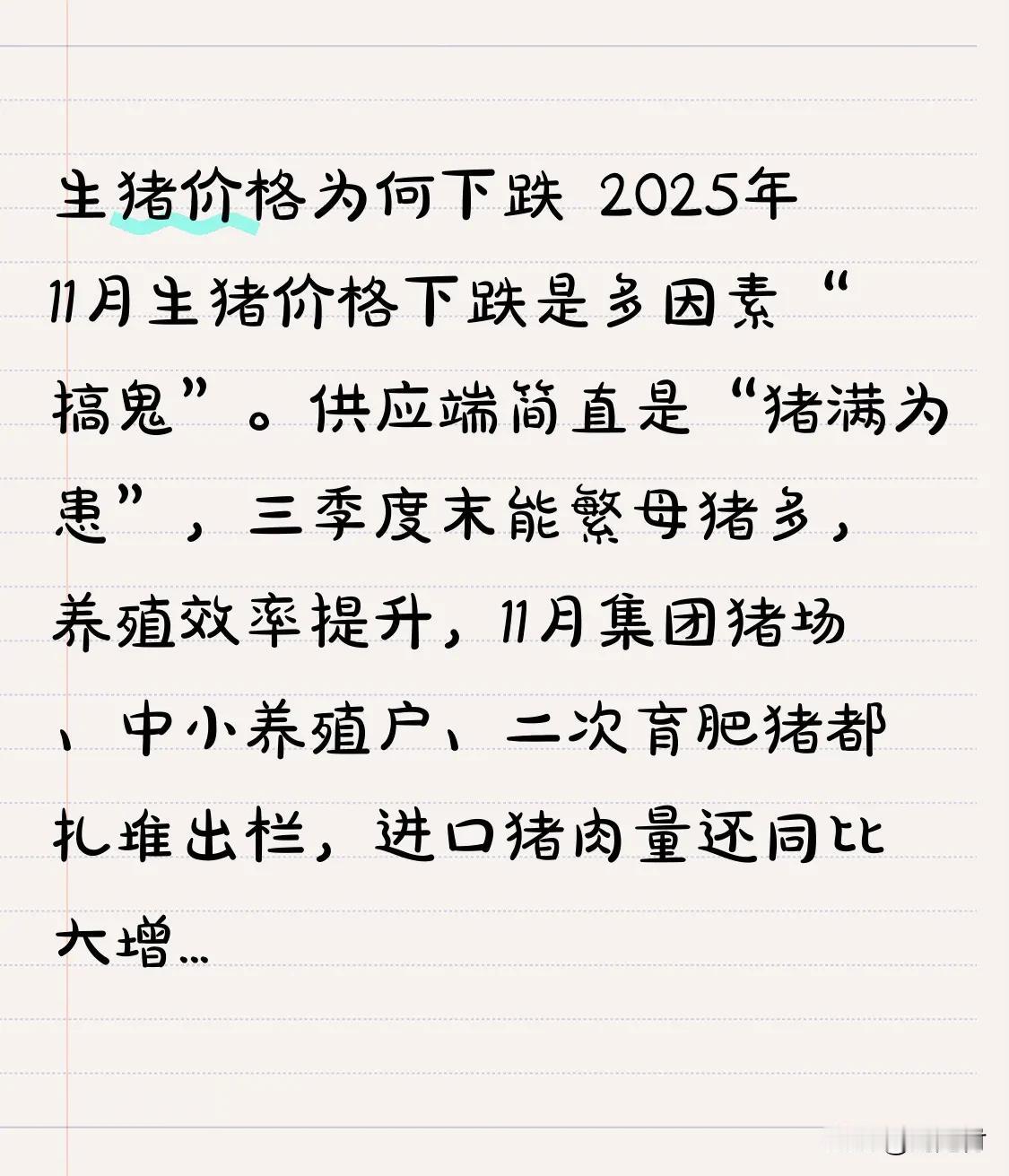 生猪价格为何下跌 生猪价格为何下跌?2025 年 11 月生猪价格下跌是多因素所致。供应端“猪满为患”,三季度末能繁母猪数量多,养殖效率提升,11 月集团猪场、中小养殖户、二次育肥猪集中出栏,进口猪肉量同比大增 41%。需求端表现不佳,腌腊旺季未启动,屠宰企业开工率低,餐饮消费下降,替代品抢占市场。 养殖户信心受挫,恐慌抛售形成降价循环,成本与售价倒挂迫使生猪提前出栏,猪价持续下跌。短期来看,到年末猪价仍将下跌,出栏量高且消费启动晚;中期到 2026 年二季度,猪价将触底震荡,产能释放影响仍在;长期来看,2026 年下半年后猪价或回暖,产能去化、消费复苏有望使猪价回升。
