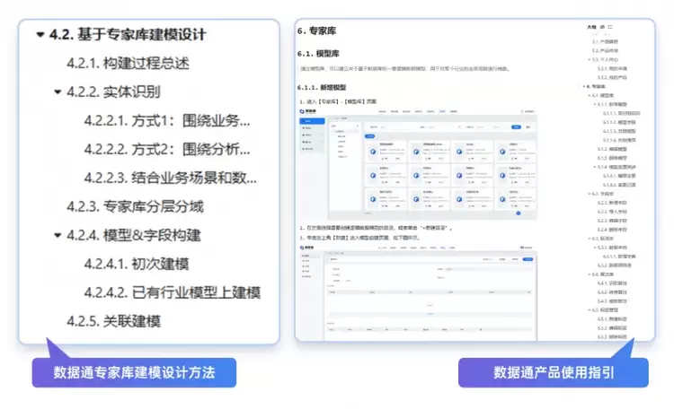 ·受众转变:Palantir更像一个“专家”平台,由数据科学家和工程师主导,通过代码进行高级别的本体定义和集成,灵活性强,但门槛高。数据通更偏向“具备数据思维的业务人员”。相较于Palantir的代码驱动模式,数据通通过可视化建模、自然语言交互等产品化设计,使业务专家也能主导数据模型构建——这正是其“轻量级”实践的核心体现。数据通产品手册中有大量详细工具的使用指引,充分体现了这种“开箱即用”的产品化思路。
