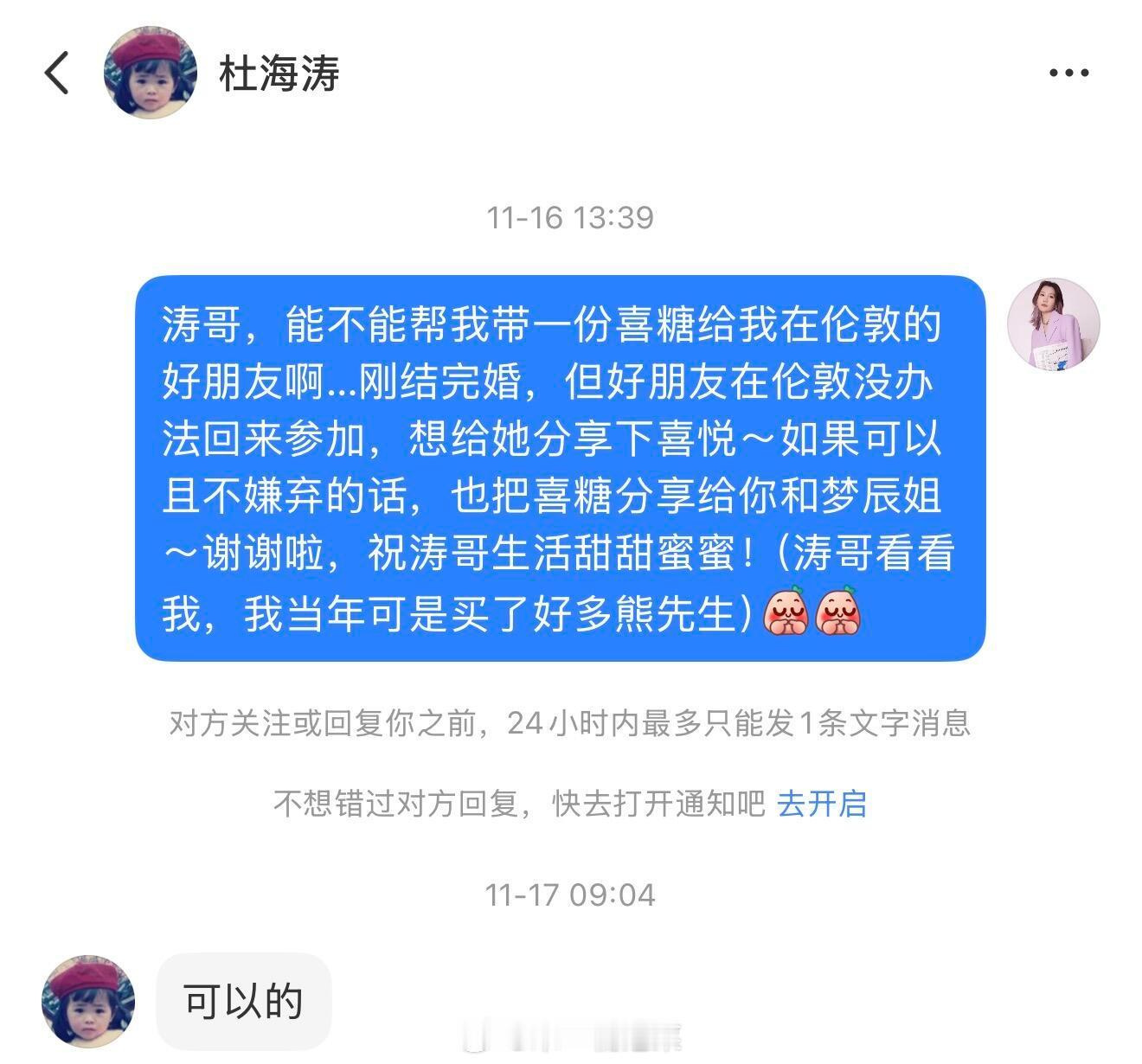 网友私信杜海涛能不能把她把喜糖带去伦敦给朋友,结果杜海涛真的帮她带过去了又刷到他