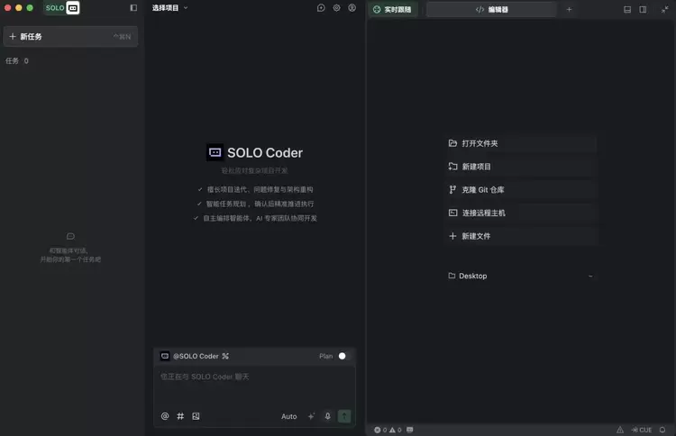 SOLO提供了三栏布局,从左到右分别为多任务列表、对话流窗口和工具面板,致力于为用户打造更清晰、高效的开发空间。