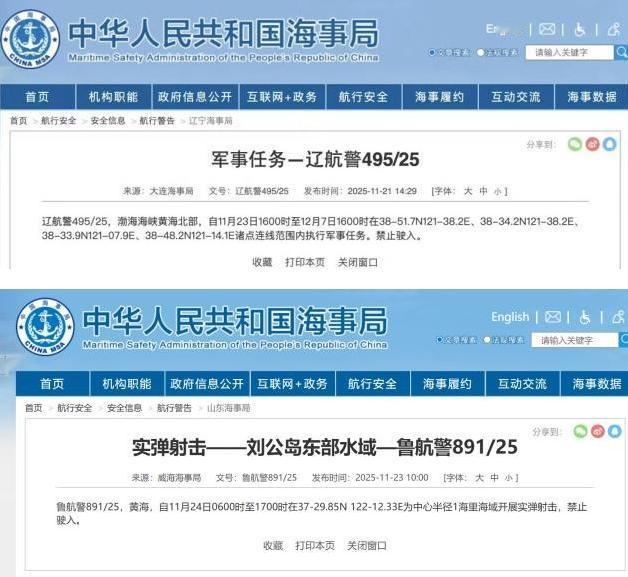 北海舰队开始军事任务,连续14天规模罕见,这次解放军动真格了 高市早苗既然死性不改,坚决不撤回错误言论,也不道歉,那就别怪中方动真格了。最近两天,中方连续发布了多份航行警告,将从11月23日至12月7日,连续14天在渤海海峡黄海北部附近执行军事任务;在11月24日于刘公岛东部水域进行实弹射击。禁止其他船只驶入该区域。 可能有人没概念,渤海海峡这地方可不是随便划块海就能练手的。它夹在辽东半岛和山东半岛之间,最窄的老铁山水道才42公里,是渤海进出黄海的唯一通道,京津冀的海上门户就攥在这儿,每年光过往的船舶就超过10万艘次。 把军事任务放在这儿,相当于在自家门户上摆开阵势,既能护住京津冀的安全,又能盯着东北亚的动静,战略分量不用多说。而且这次不是“小打小闹”,青岛、威海的军港里,一艘艘舰艇接连出港,带头的还是055型驱逐舰,雷达转得飞快,空中的预警机也拉到高空,把整片海域的情况都盯得死死的。 11月18日到20日,中美两军刚在夏威夷开完会,中方代表当时就把话挑明了:坚决反对任何侵犯中国权益的挑衅行为。会后中方还特意通过外交渠道,把底线清清楚楚告知了美日韩这些周边国家。 说白了,该走的程序都走了,该提的醒也提了,是高市早苗自己非要往红线上撞。她在日本议会里还硬撑着说要加强和美韩合作,可国内早就乱了套,自民党的温和派都在埋怨她把局势搞僵,连首相府外都有民众抗议,她这“硬骨头”其实早被架在了火上。 这次军事任务的细节更能看出“动真格”的诚意。不光时间长,科目还实,驱逐舰要练导弹发射,潜艇要练鱼雷攻击,连火箭军的陆基部队都在后方待命,搞多兵种协同。这哪是简单的训练,分明是把中国海军的新家底亮出来给有心思的人看看。 后勤保障也跟上了节奏,大连港的卡车连夜往码头运物资,医疗船在附近海域巡回,官兵轮班休息,硬是把高强度的任务扛了下来。电子战模块更是没闲着,专门干扰模拟的敌方信号,五十海里内的可疑信号都逃不过监控。美军倒是派了P-8侦察机在远处转悠,可终究没敢靠近,只能远远看着;日本外务省刚开始还跳出来说“加剧紧张”,见中方态度坚决,后来也没了声音。 11月24日刘公岛的实弹射击更是耐人寻味,这地方可是甲午战争的旧址,在这儿打靶,既是告慰先烈,也是提醒所有人:中国海军早就不是当年的样子了。现在黄海北部的海面安安静静,过往的国际航运公司都乖乖改道,虽然绕行成本涨了两成,但没人敢拿安全冒险。卫星图上能清楚看到,解放军的编队摆成了多层防御圈,里里外外把任务区域守得严严实实。 说到底,中方从来不是主动挑事的一方,但也绝不怕事。高市早苗以为靠美韩就能撑住场面,却忘了西方从来都是“看菜下碟”,美军的侦察机不敢靠近,韩国也在旁边观望,最后只剩她自己骑虎难下。这次14天的军事任务就是一次明确的表态:别拿中国的克制当软弱,也别拿历史的教训当耳旁风。 等任务结束,海面会恢复平静,但那些想挑衅的人该明白,中国的海疆不是谁都能撒野的地方,真把解放军惹急了,后果只会比这更严重。高市早苗要是还拎不清,接下来的麻烦恐怕就不是几句硬话能解决的了。