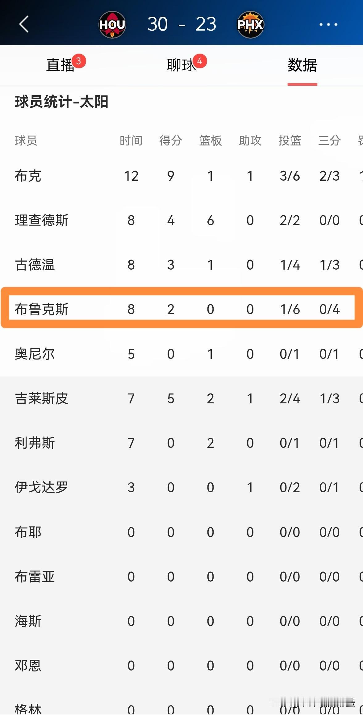 太阳球星狄龙-布鲁克斯真是太懂事了!在今天太阳主场迎战火箭的比赛中,目前双方的首节比赛已经结束,太阳以23:30落后于对手。值得一提的是,此役面对旧主狄龙在第一节比赛中彻底的迷失了自我,他在首发出战的8分钟里,投篮6中1,其中三分球4中0非常低效的得到2分。 不得不说,狄龙真是太懂事了,他用自己的糟糕表现回馈了老东家当初对自己的厚爱。