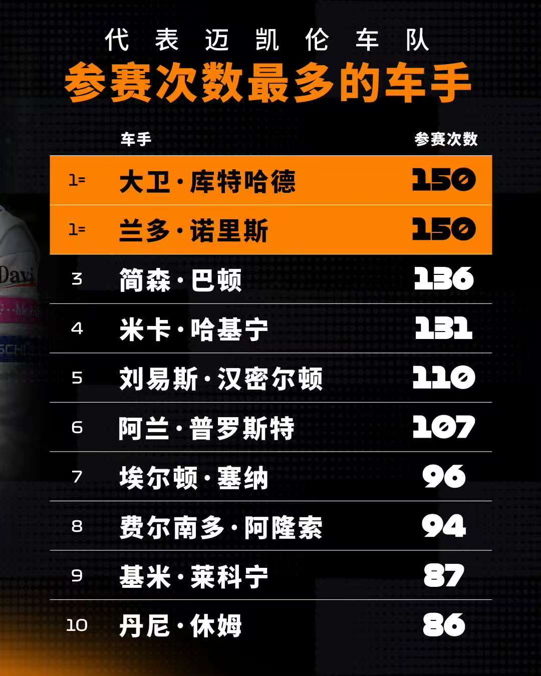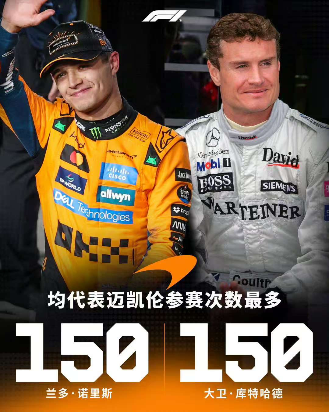 虎扑11月25日讯据F1官方消息,兰多-诺里斯在周末的F1拉斯维加斯大奖赛后追平大卫-库特哈德,以150次参赛并列成为代表迈凯伦参赛次数最多的F1车手。