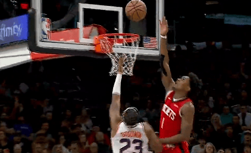 第三节比赛中,古德温抢断反击上篮,阿门-汤普森贴身回防送上排球大帽。